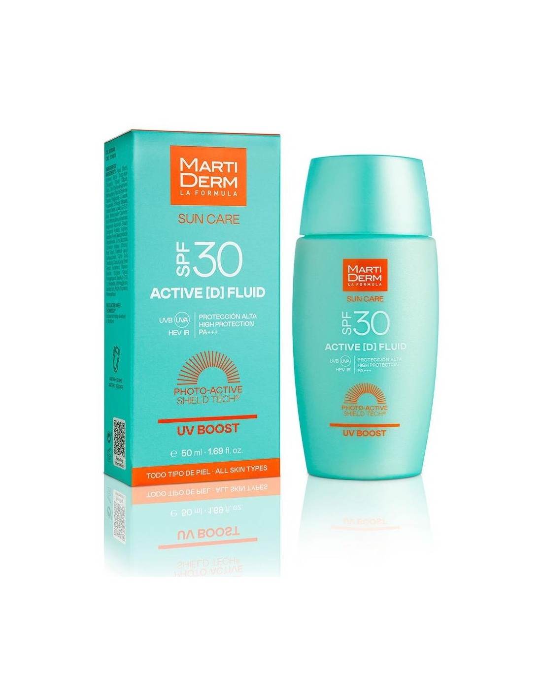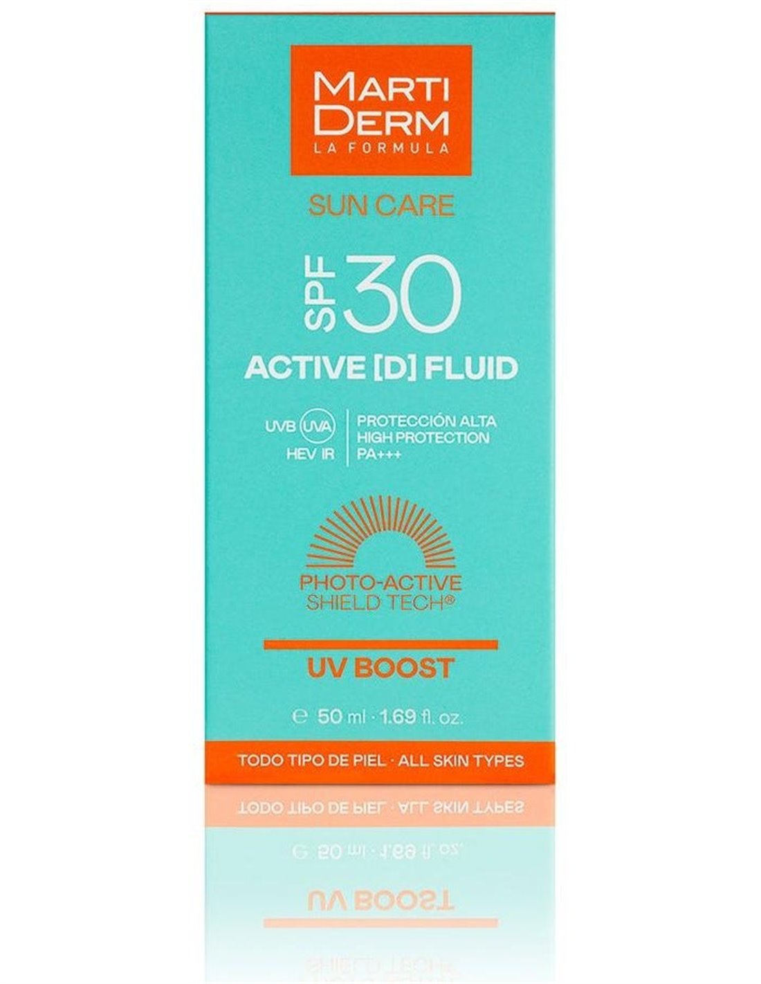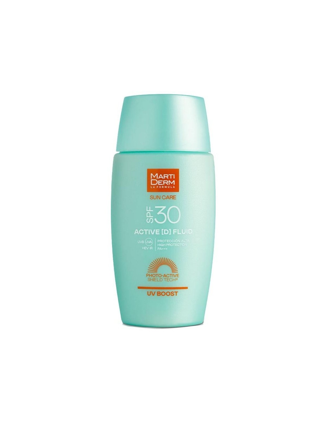 Martiderm Sun Care Active D Fluid UV Boost SPF30 50ml es un fotoprotector facial de textura fluida que incluye la tecnología Photo-Active Shield Technology, que protege la piel de los rayos UVA, UVB, IR y luz azul.