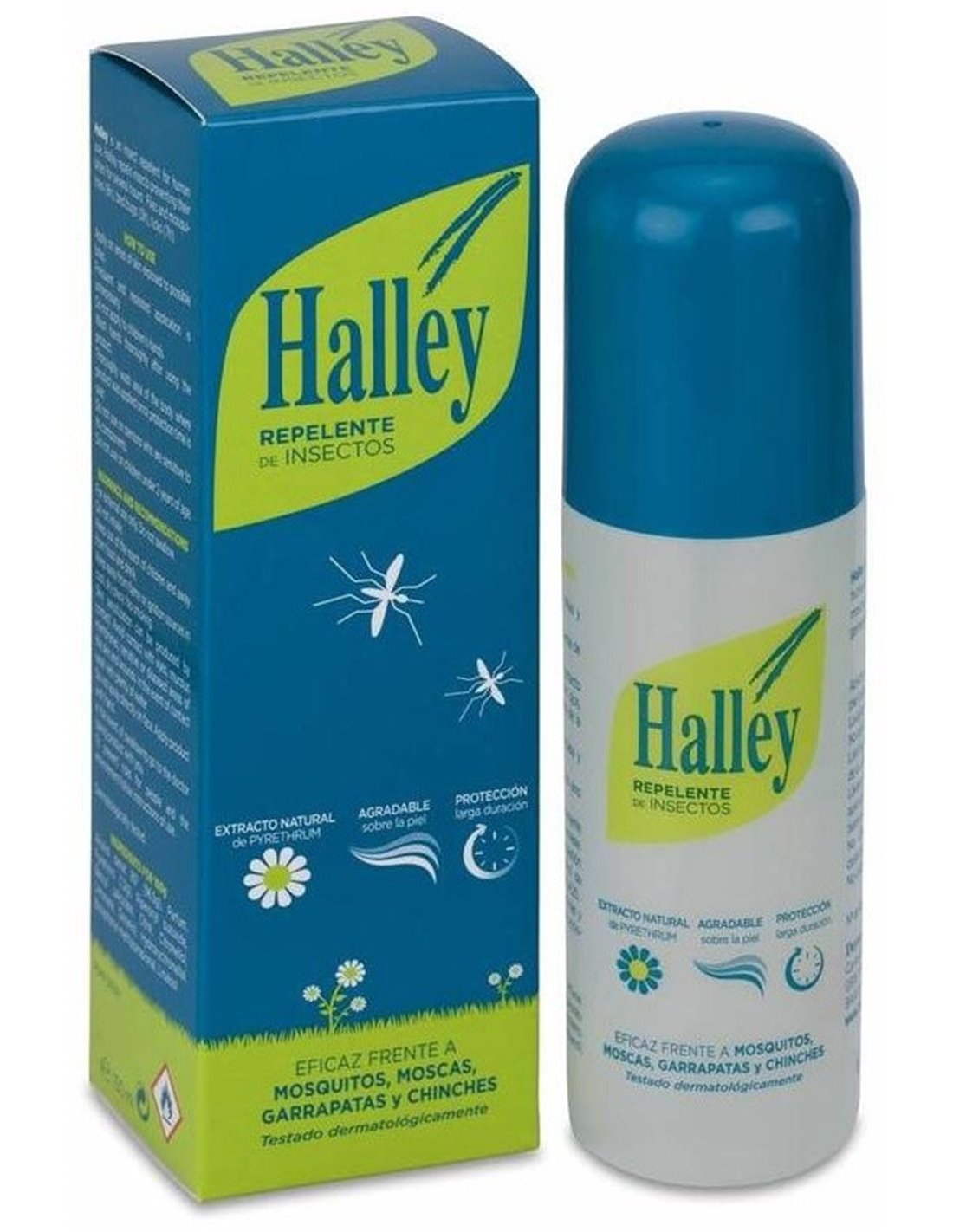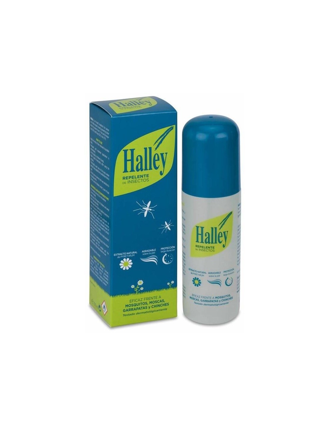 HALLEYSpray que aprovecha las propiedades del extracto natural de pirethrum (obtenido de una flor del tipo crisantemo llamado piretro) para mantener alejados a los insectos y evitar molestias y picaduras. Esta fórmula, de origen natural, es muy efectiva como repelente frente a todo tipo de insectos: mosquitos tropicales (incluido el mosquito tigre), avispas, abejas, tábanos, moscas, etc. Una vez aplicado resulta agradable y fresco debido a su aroma y a que no engrasa la piel. Ideal para viajes de 15 a 20 días.
