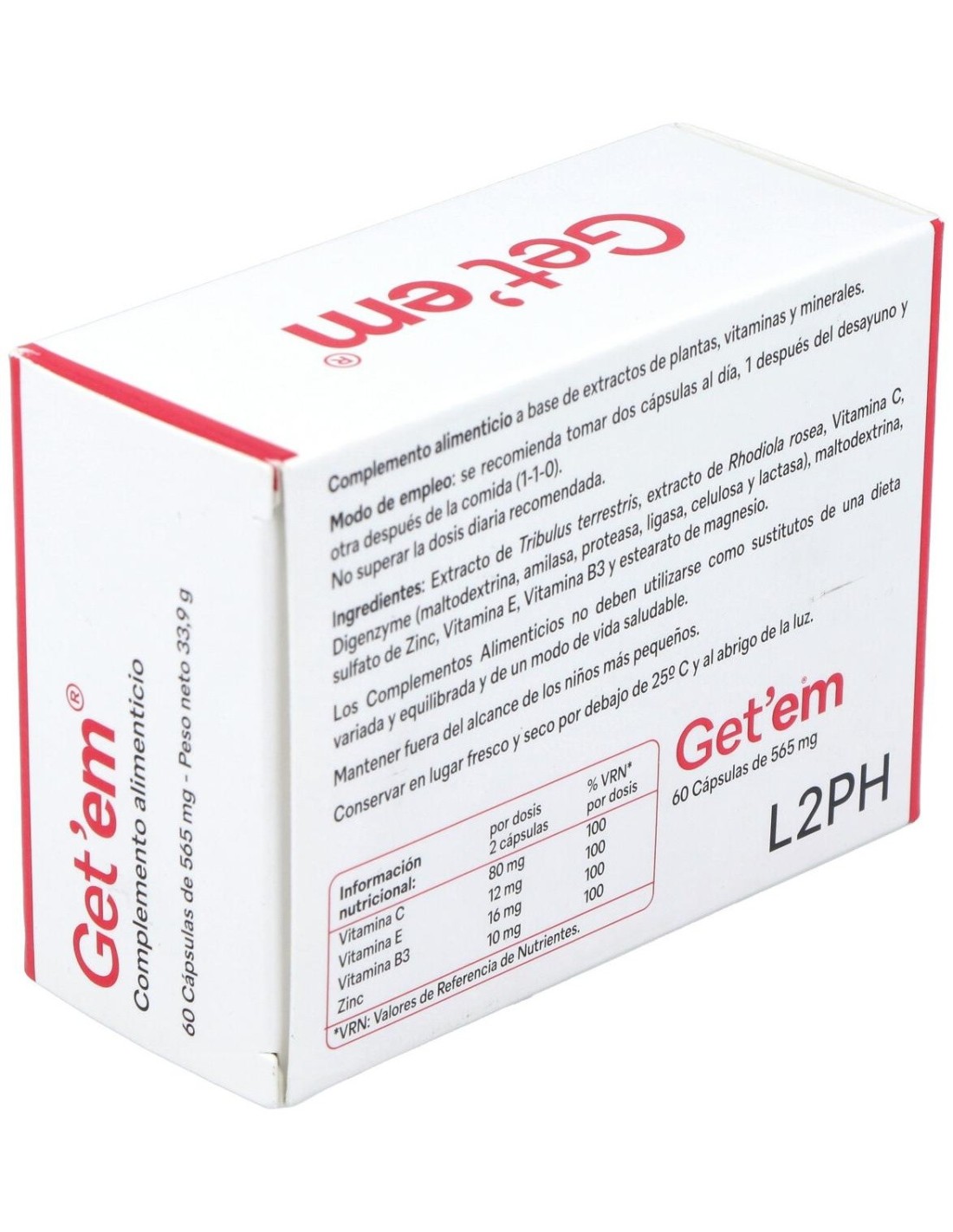 Getem® es un complemento alimenticio que suaviza los síntomas de la menopausia y post-menopausia, así como la andropeina, tales como sofocos, cambios de humor y fatiga física. Además, Get'em® te ayudará asuperar la falta de deseo sexual en la pareja. En hombres ayuda en la falta de deseo sexual, a la impotencia y en la vitalidad y movilidad de los espermatozoides. Su fórmula es a base de extractos de plantas, L-arginina vitaminas y minerales.