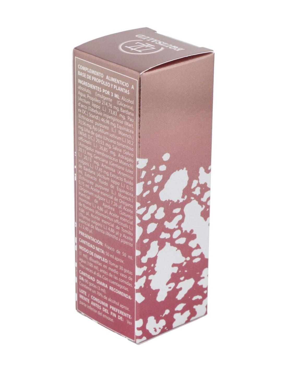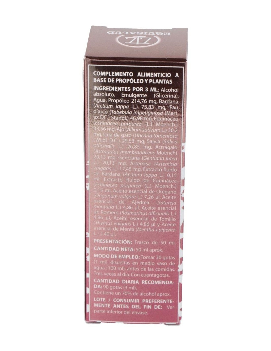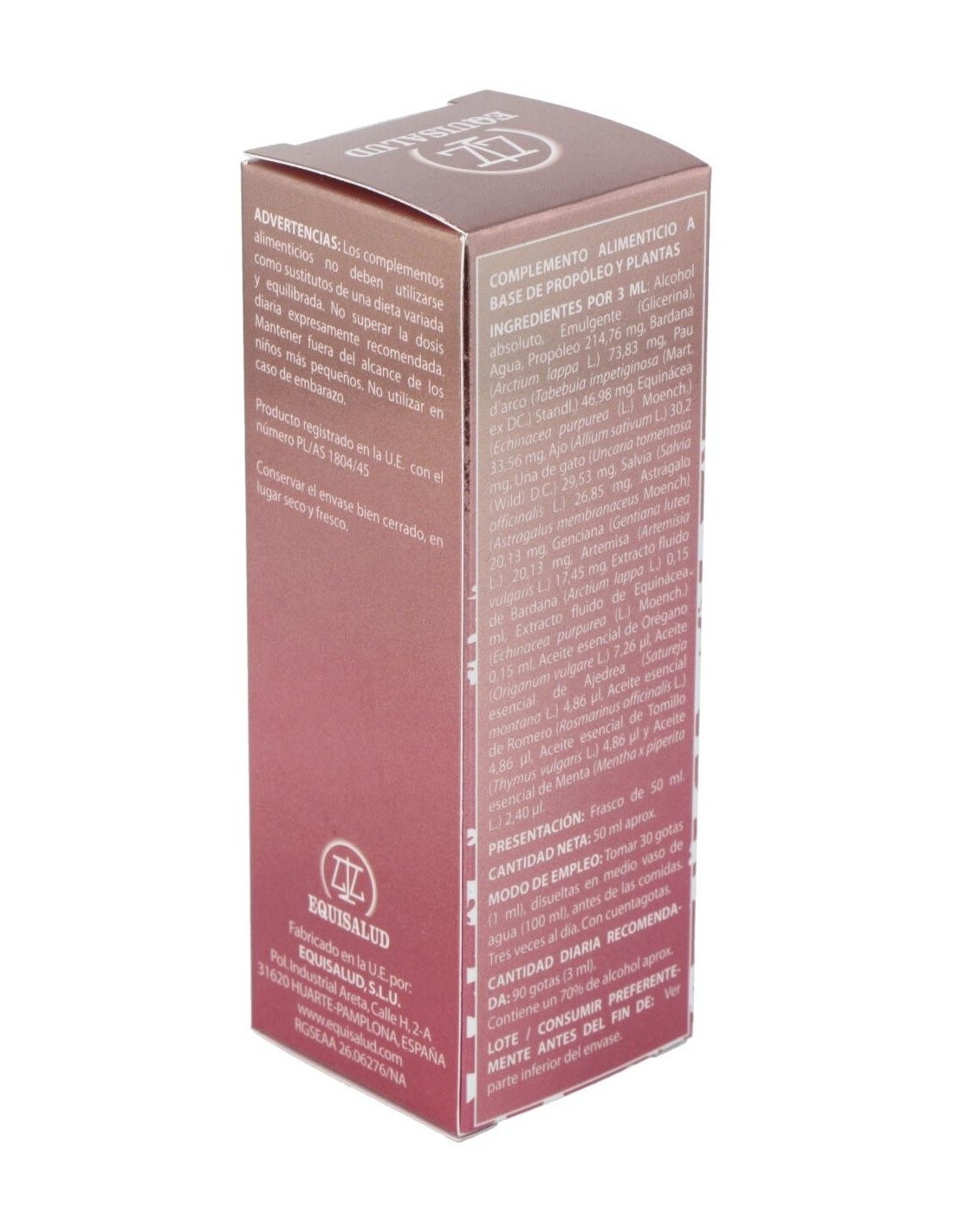 Composición:Propóleo, ajo (Allium sativum), uña de gato (Uncaria tomentosa), equinácea (Echinacea purpurea), astrágalus (Astragalus membranaceus), bardana (Arctium lappa), artemisa (Artemisia vulgaris), pau darco (Tabebuia avellanedae), salvia (Salvia officinalis), genciana (Gentiana lutea), orégano (Origanum vulgare), ajedrea (Satureja montana), romero (Rosmarinus officinalis), tomillo (Thymus vulgaris), menta (Mentha piperita). FV (frecuencias vibracionales):