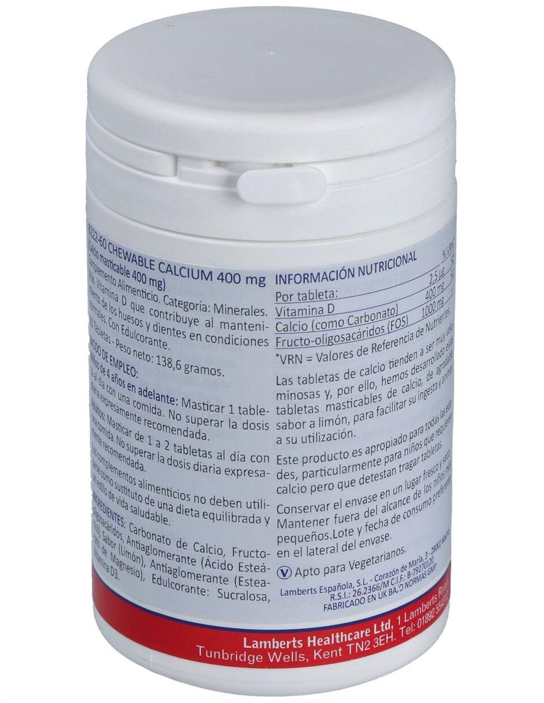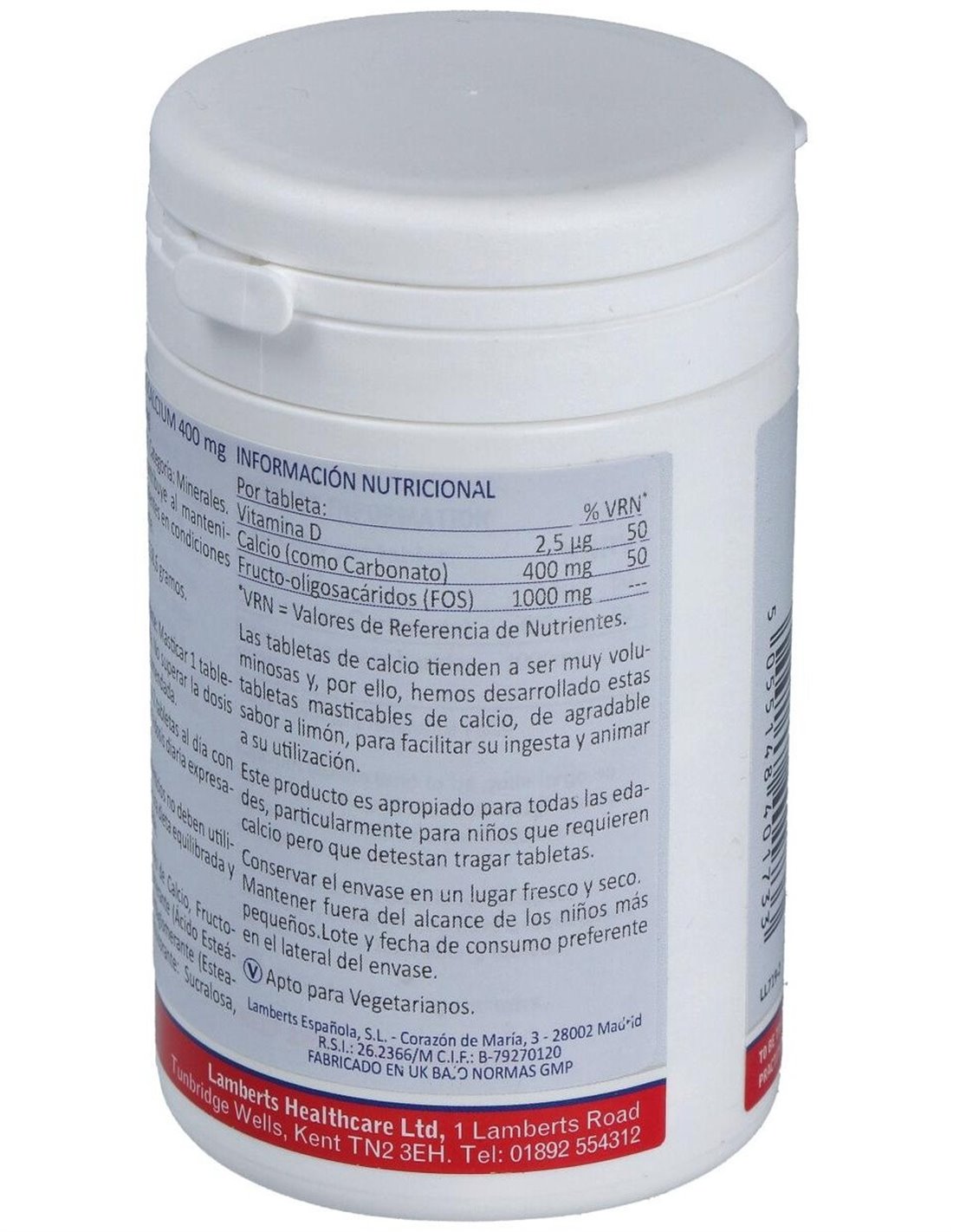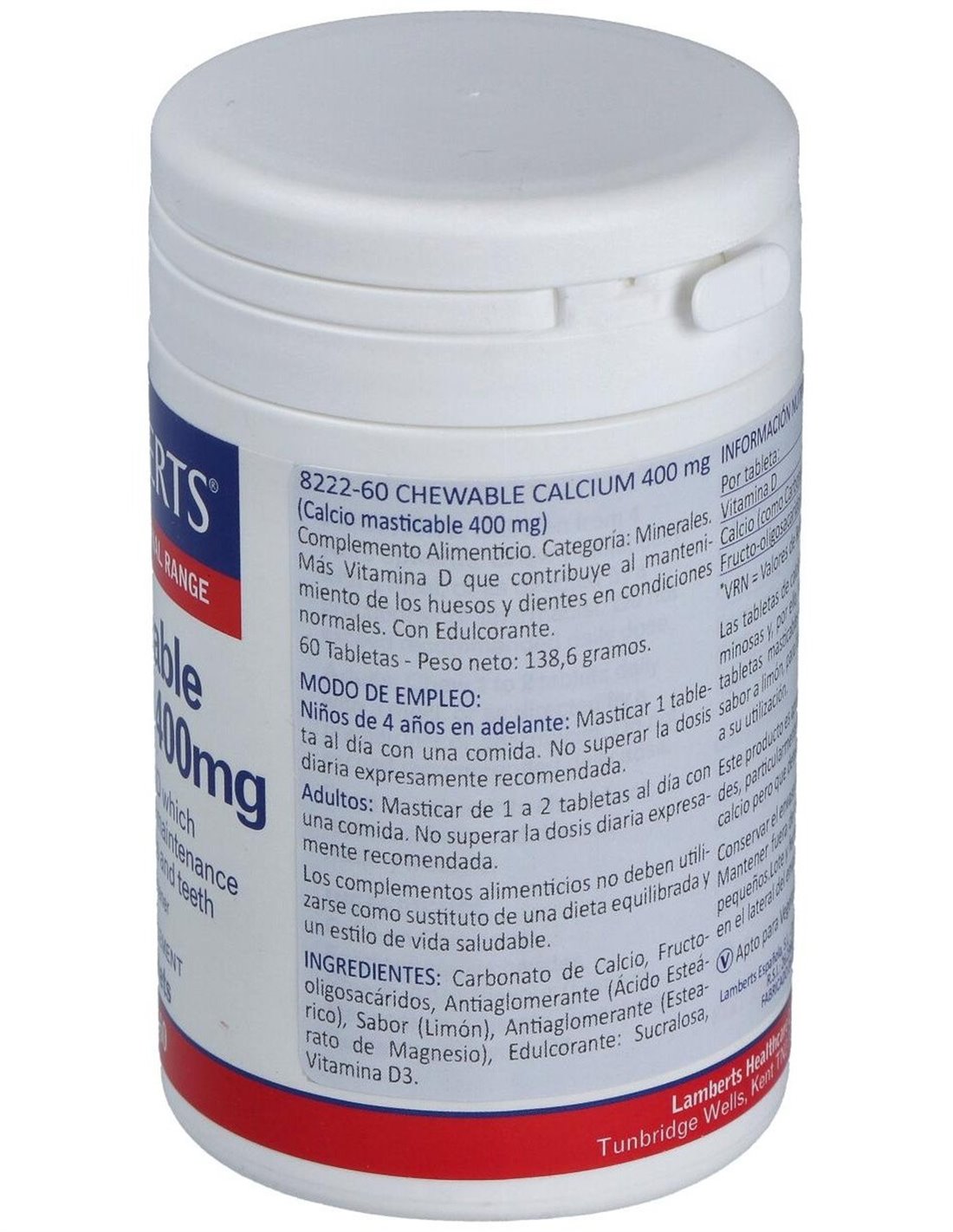 Calcio Masticable 400 mg (Con Vitamina D3 y FOS) 60 Tabs. de Lamberts
