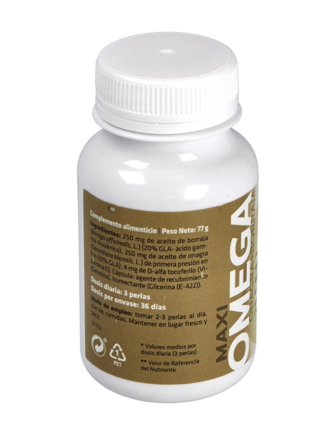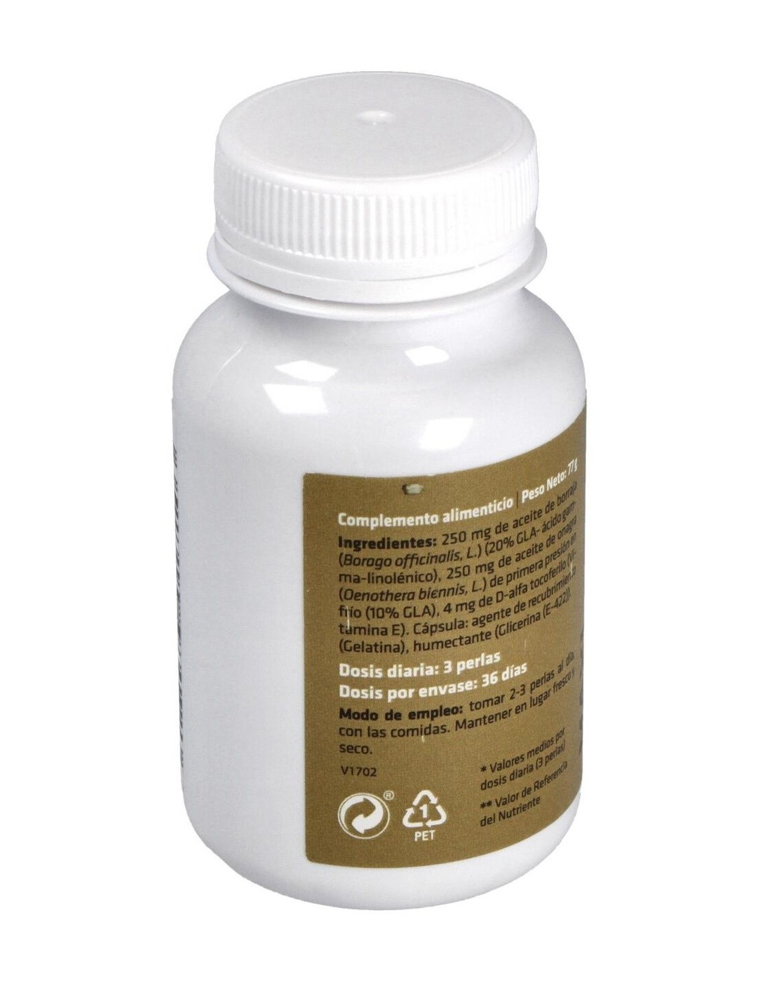 Ingredientes:250 mg de aceite de borraja (Borago officinalis, L.) (20% GLA- ácido gam-ma-linolénico), 250 mg de aceite de onagra (Oenothera biennis, L.) de primera presión en frío (10% GLA), 4 mg de D-alfa tocoferilo (Vi-tamina E). Cápsula: agente de recubrimiento (Gelatina), humectante (Glicerina (E-422)).Modo de empleo:Tomar de 2 a 3 perlas al día repartidas en varias tomas con comida.Presentación:Envase de 110 perlas.
