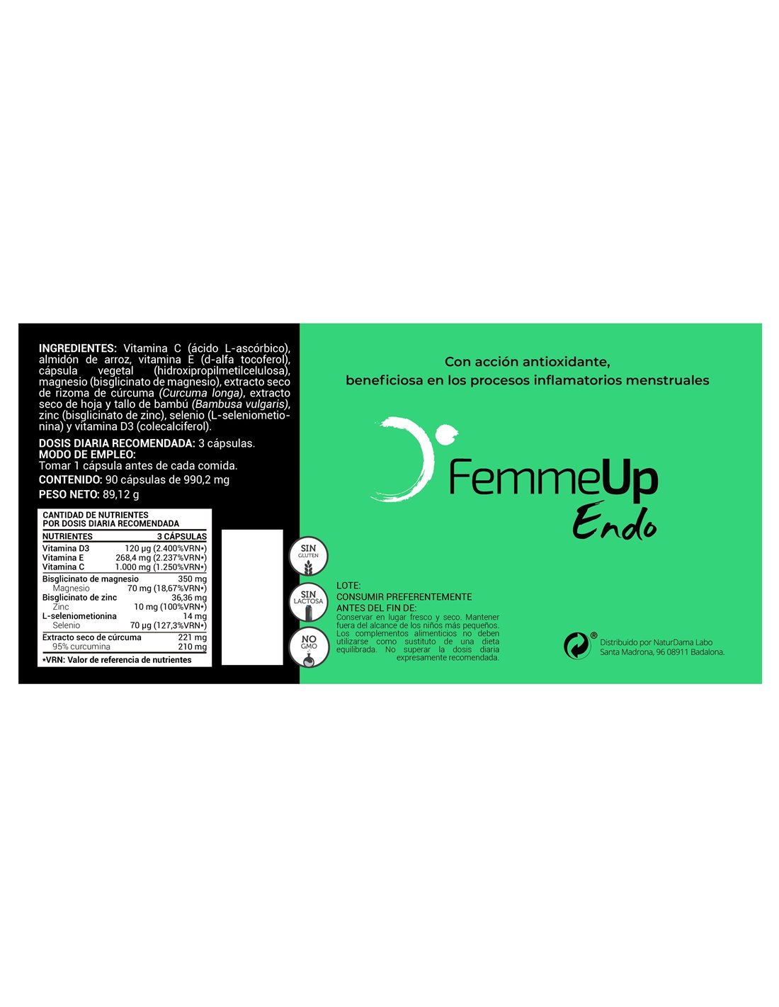 Complemento alimenticio a base de antioxidantes, especialmente diseñado para dar a poyo a la mujer durante la menstruación. Aporta curcumina que puede ser de utilidad en caso de inflamación, así como vitaminas que contribuyen a proteger las células del daño oxidativo como la C, E y D, así como selenio. Producto sin gluten ni lactosa. 100% vegano.