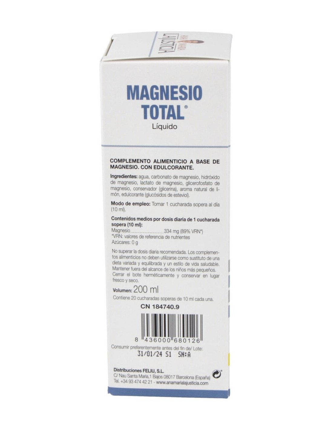 El Magnesio Total Líquido Sabor Limón 200Cc de Ana María Lajusticia es un suplemento mineral para adultos que contribuye al equilibrio de magnesio, facilitando su absorción gracias a su fórmula líquida y sabor agradable.