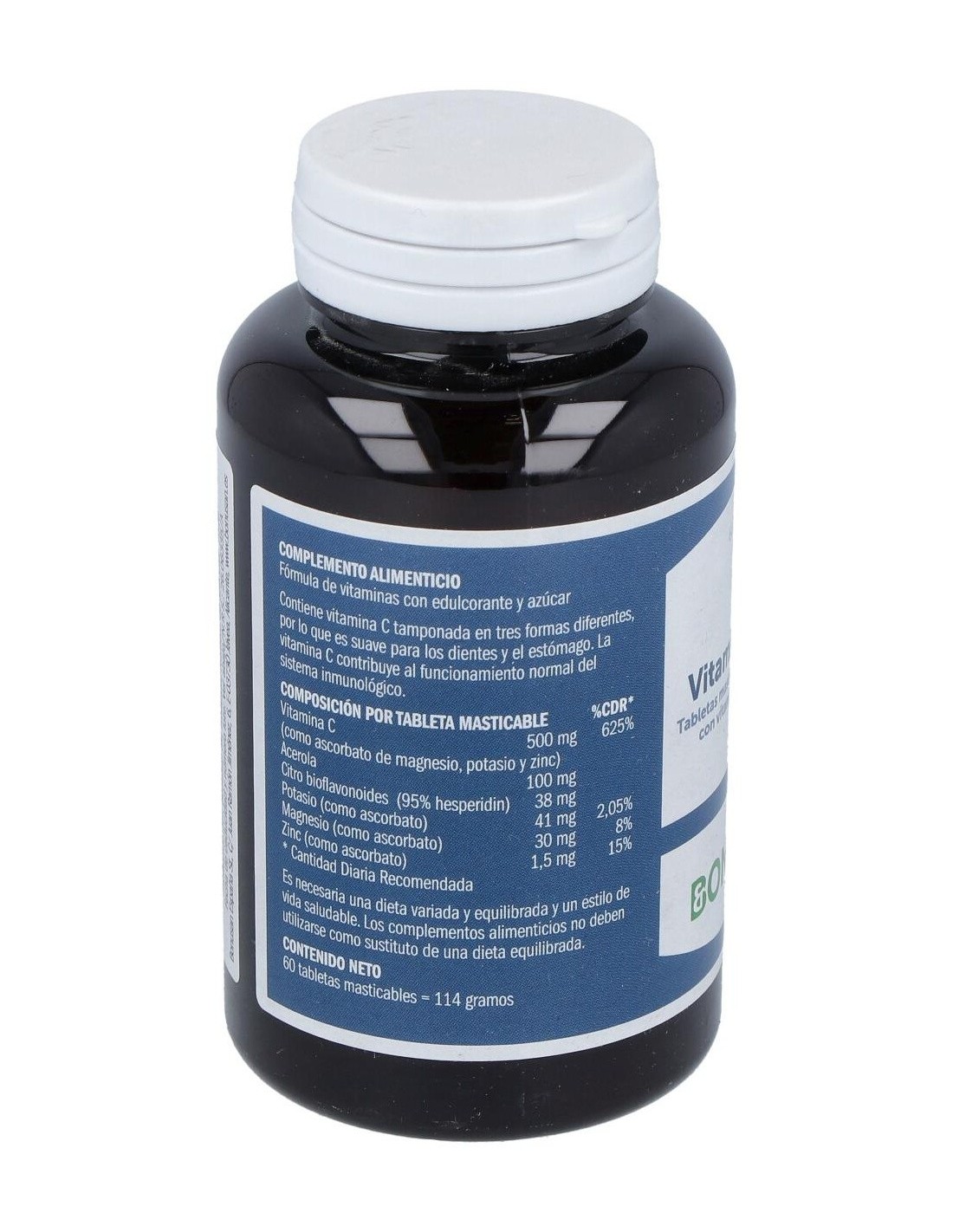 Edulcorante (fructosa, manitol), vitamina C (ascorbato de magnesio, ascorbato de potasio), agente de carga (celulosa (HPC)), acerola, citro bioflavonoides, antiaglomerante (estearato de magnesio), vitamina C (ascorbato de zinc), sabor (sabor natural de naranja).