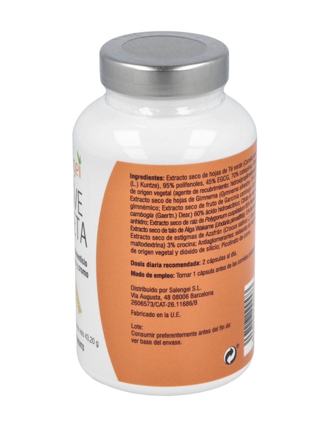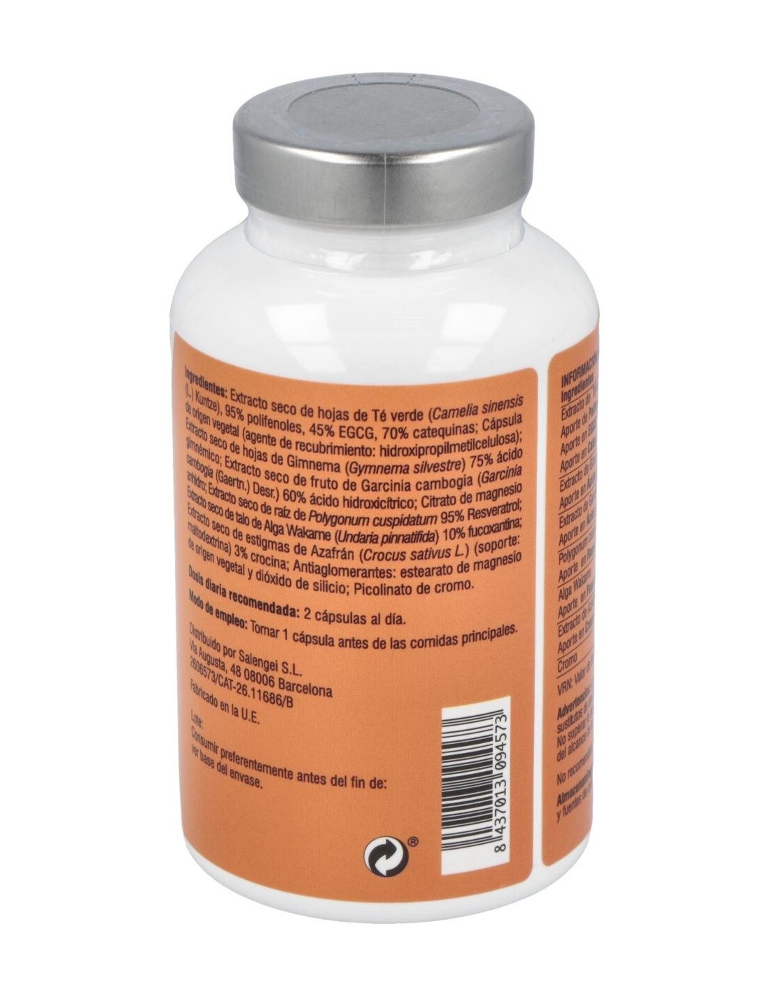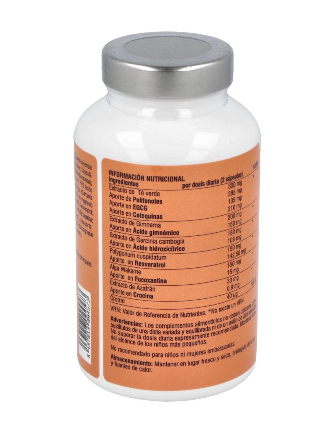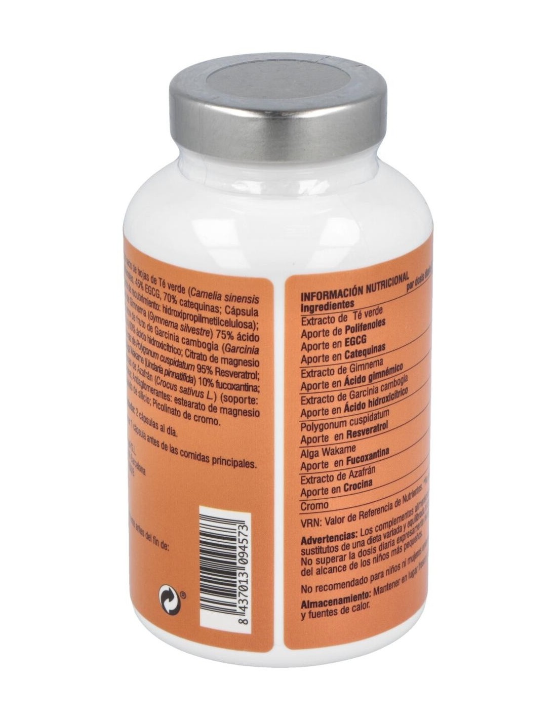 Ingredientes:Extracto seco de hojas de Té verde (Camelia sinensis (L.) Kuntze), 95% polifenoles, 45% EGCG, 70% catequinas; Cápsula vegetal (Agente de recubrimiento: hidroxipropilmetilcelulosa); Extracto seco de hojas de Gimnema (Gymnema silvestre) 75% ácido gimnémico; Extracto seco de fruto de Garcinia cambogia (Garcinia cambogia (Gaertn.) Desr.) 60% ácido hidroxicítrico; Citrato de Magnesio anhidro; Extracto seco de raíz de Polygonum cuspidatum 95% Resveratrol; Extracto seco de talo de Alga Wakame (Undaria pinnatifida) 10% fucoxantina; Extracto seco de estigmas de Azafrán (Crocus sativus L.) 3% crocina; Espesante: goma arábiga; Extracto seco de tronco de Bambú (Bambusa arundinacea) 70% sílice; Picolinato de cromo. Modo de empleo:Tomar 2-3 cápsulas al día antes de las comidas principales. Presentación:Envase de 60 cápsulas.Recomendaciones y advertencias:No contiene gluten.