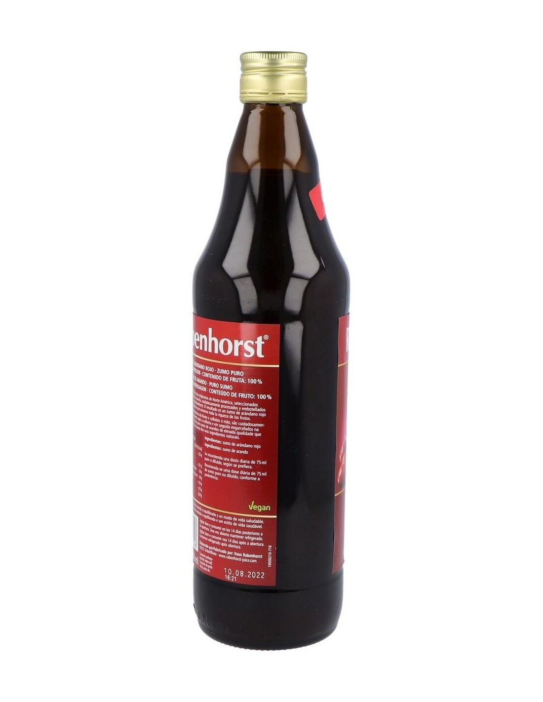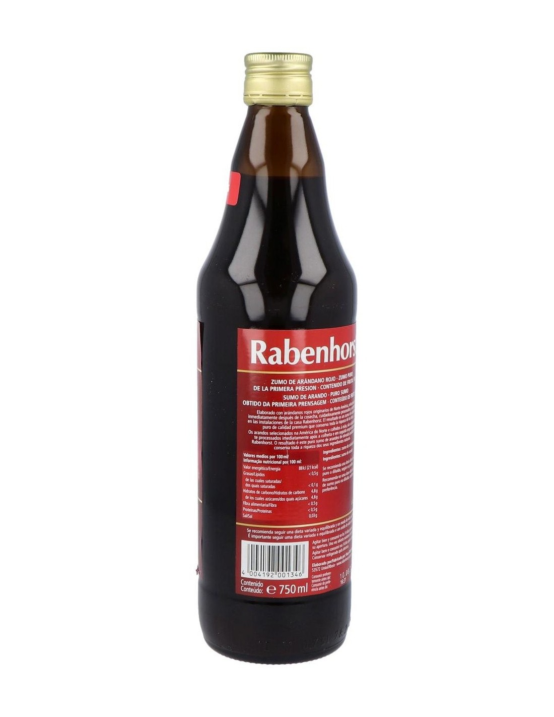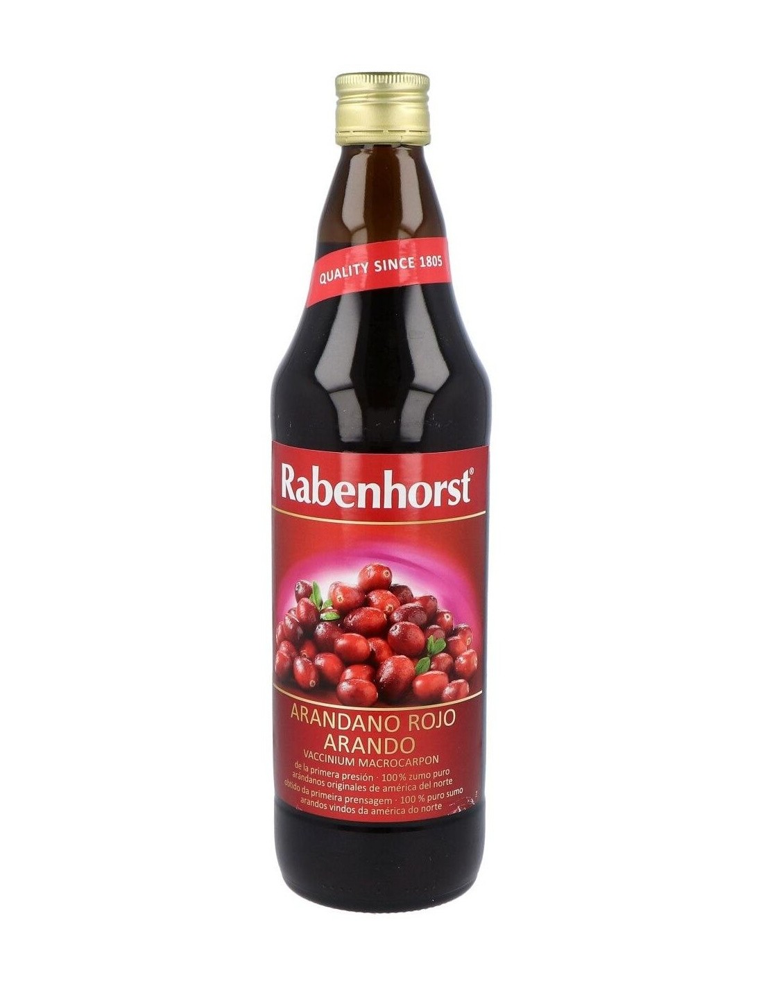 Ingredientes:100% zumo puro de arándano rojo (Vaccinium macrocarpon).Valor nutricional por 100 ml: