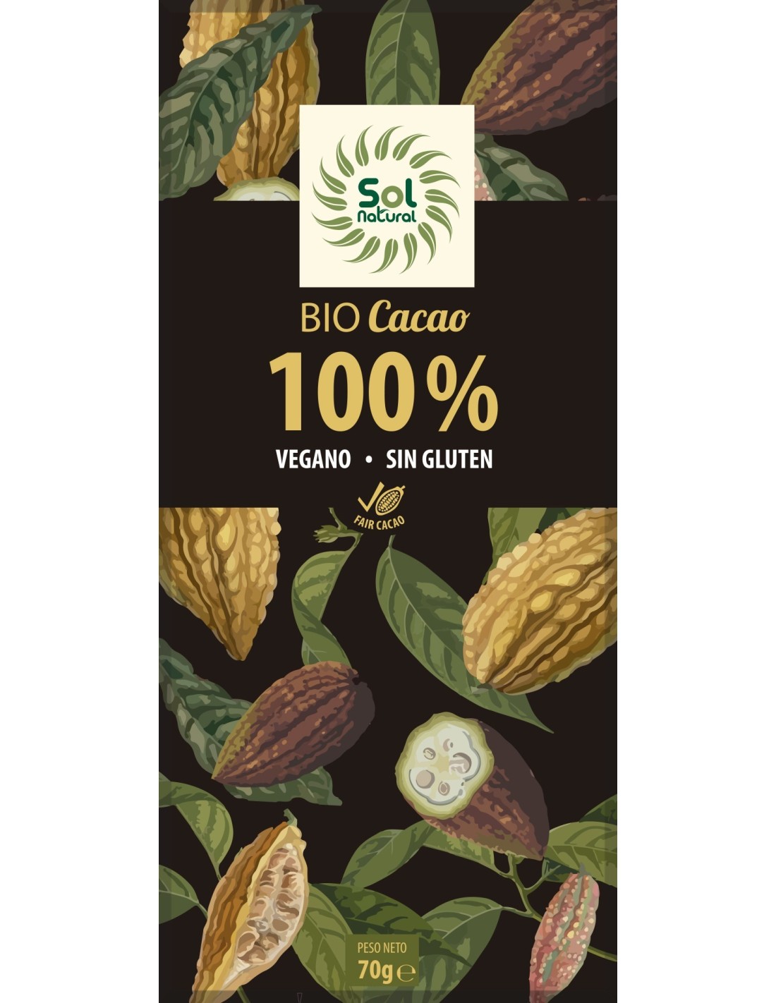 Chocolate vegano 100% de cacao, bajo en calorías. Contiene manteca de cacao y pasta de cacao y se obtiene un producto puro. Es una fuente de antioxidantes y posee propiedades cardiosaludables. El cacao puro ayuda al cerebro a producir anandamida, un neurotransmisor responsable de la sensación de euforia y placer. Es un producto vegano y con certificación bio. Apto para consumo diario.