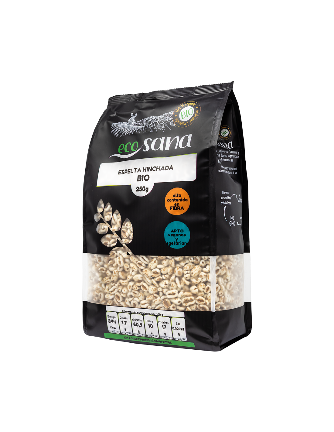 Ingredientes:Espelta hinchada* (53,3%), azúcar de caña*, jarabe de maíz*, miel* (4,1%), aceite de girasol*. (*) Procedente de agricultura ecológica.Valor nutricional por 100 gramos: