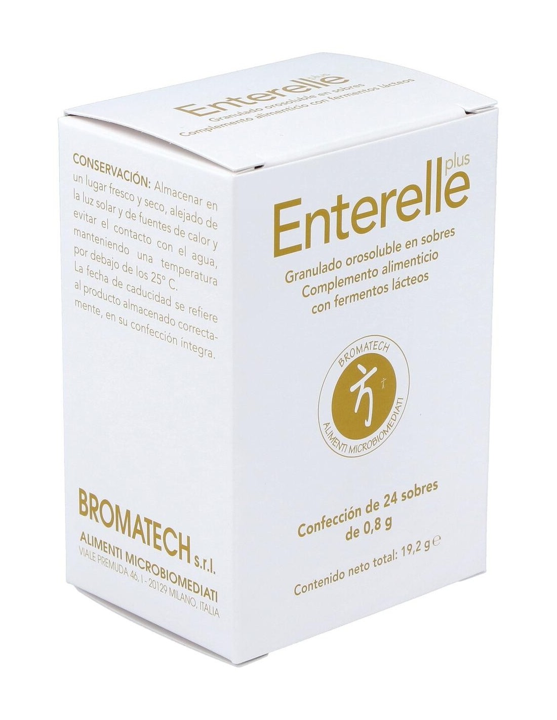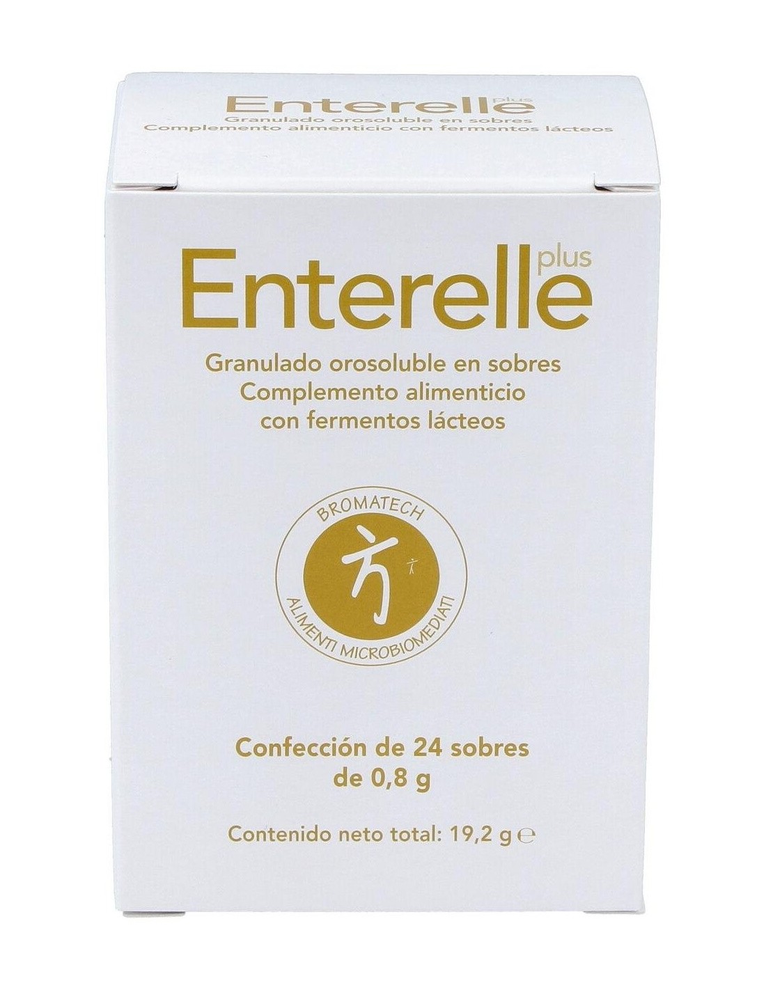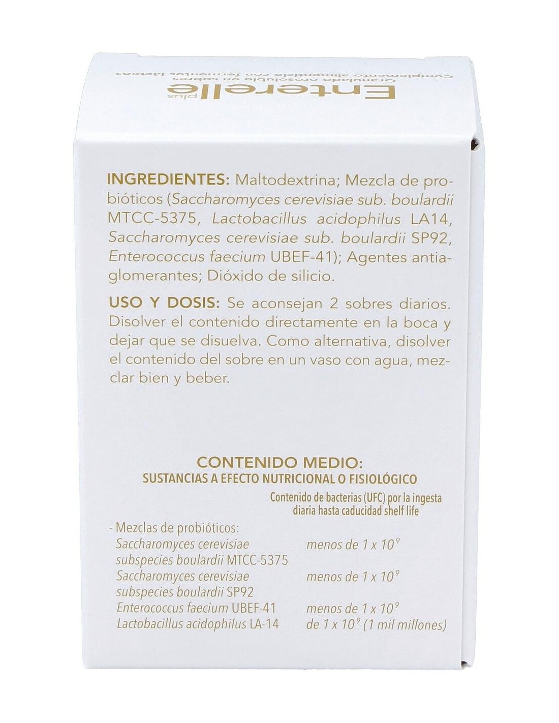 Enterelle Plus es un probiótico del laboratorio Bromatech, que en su formulación contiene cepas probióticas específicas para contribuir al equilibrio intestinal y que han demostrado sobrevivir a la acción de algunos antibióticos.Los microorganismos contenidos en Enterelle Plus, como el S. boulardii SP92, S. boulardii MTCC5375, E. faecium UBEF41 y el L. acidophilus LA14 pueden contribuir a reequilibrar el tránsito intestinal en caso de diarrea, reducir la flora micótica como la Candida albicans y mantener la microbiota en equilibrio.Ingredientes:Mezcla de probióticos (Saccharomyces cerevisiae sub. boulardii MTCC-5375, Saccharomyces cerevisiae sub. boulardii SP92, Enterococcus faecium UBEF-41, Lactobacillus acidophilus LA14); antiaglomerantes: sales de magnesio de ácidos grasos, dióxido de silicio; colorante: carbonato de calcio.Modo de empleo:Tomar 2 sobres por día, después de las comidas, con un vaso de agua.Presentación:Envase de 24 sobres.