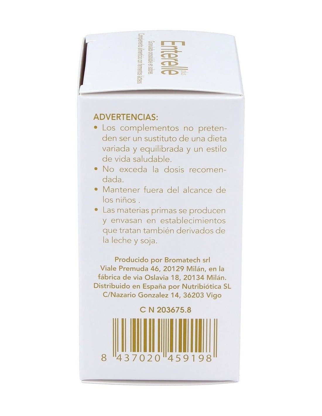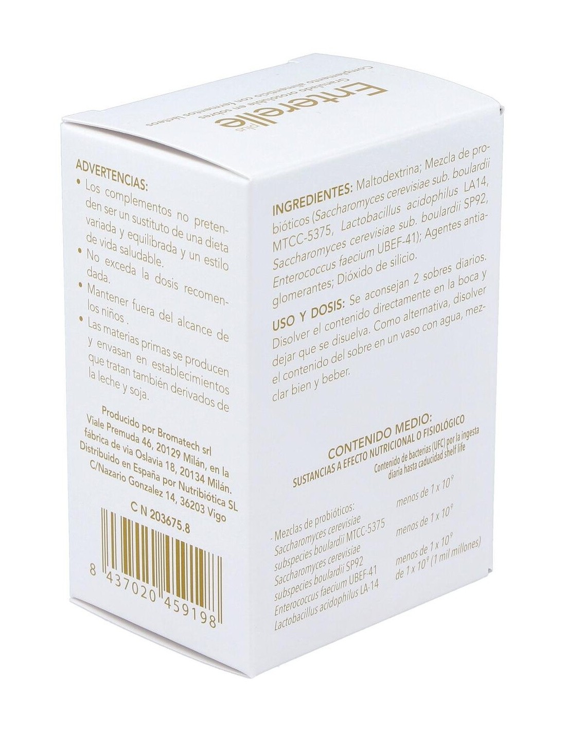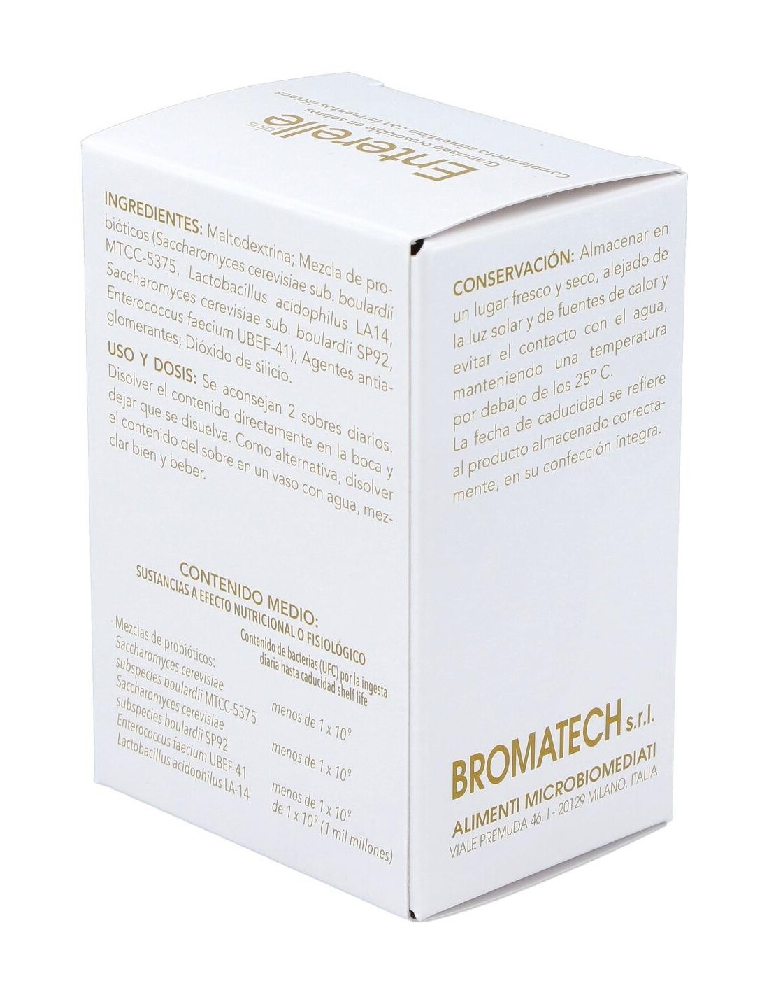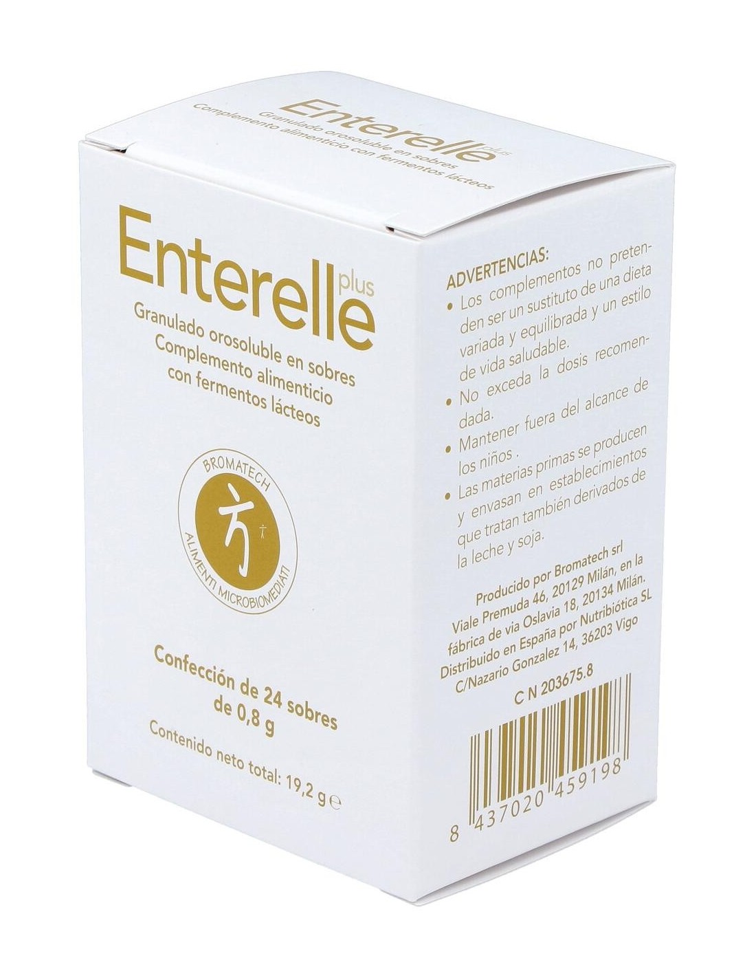 Enterelle Plus es un probiótico del laboratorio Bromatech, que en su formulación contiene cepas probióticas específicas para contribuir al equilibrio intestinal y que han demostrado sobrevivir a la acción de algunos antibióticos.Los microorganismos contenidos en Enterelle Plus, como el S. boulardii SP92, S. boulardii MTCC5375, E. faecium UBEF41 y el L. acidophilus LA14 pueden contribuir a reequilibrar el tránsito intestinal en caso de diarrea, reducir la flora micótica como la Candida albicans y mantener la microbiota en equilibrio.Ingredientes:Mezcla de probióticos (Saccharomyces cerevisiae sub. boulardii MTCC-5375, Saccharomyces cerevisiae sub. boulardii SP92, Enterococcus faecium UBEF-41, Lactobacillus acidophilus LA14); antiaglomerantes: sales de magnesio de ácidos grasos, dióxido de silicio; colorante: carbonato de calcio.Modo de empleo:Tomar 2 sobres por día, después de las comidas, con un vaso de agua.Presentación:Envase de 24 sobres.