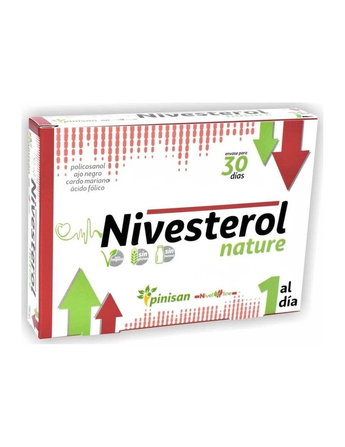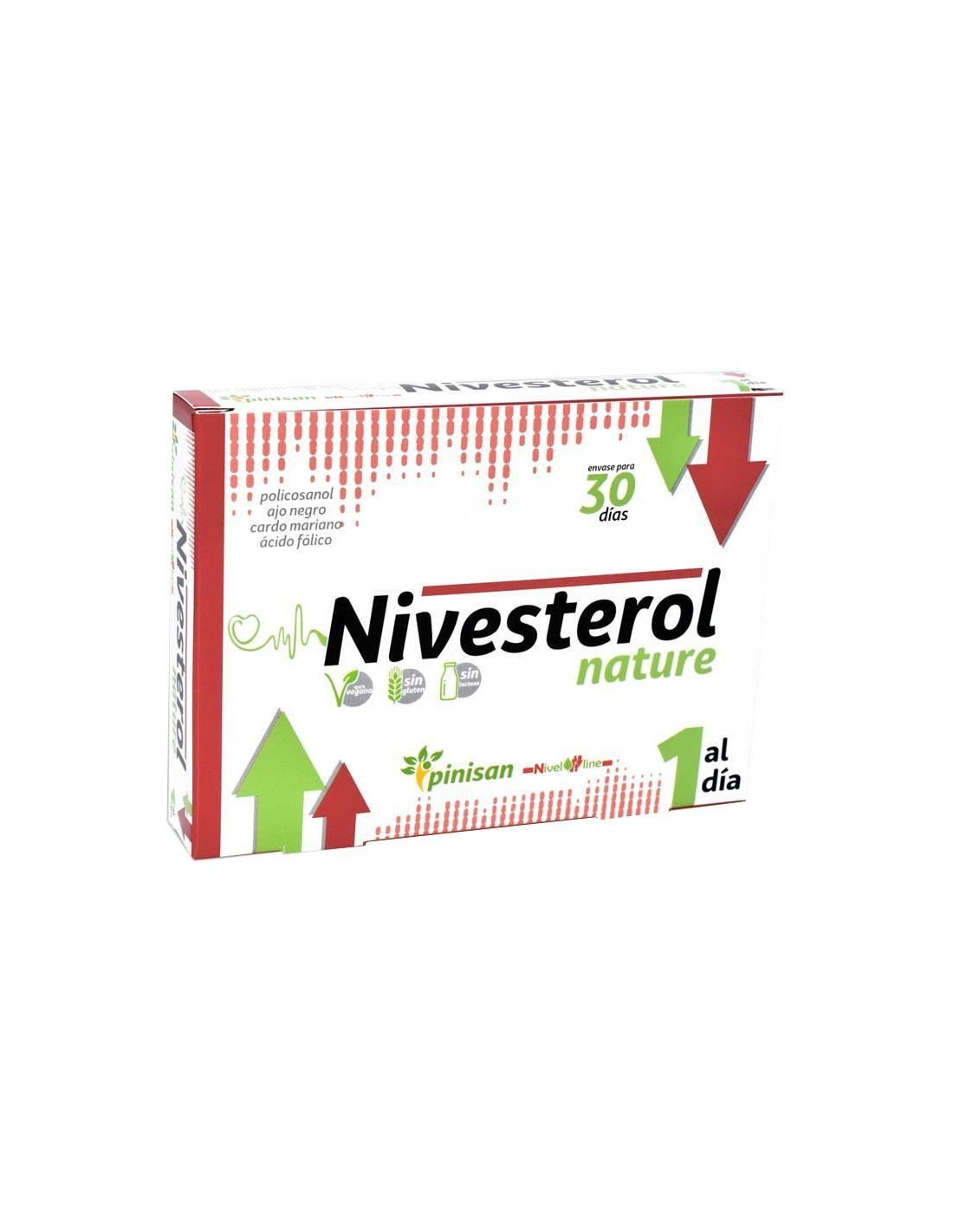 ¿Qué es la hipercolesterolemia?Las particulas LDL son las encargadas de transportar el colesterol a los tejidos. Cuando el colesterol unido a las particulas LDL superan ciertos límites, tiende a depositarse en la pared de las arterias formando un tipo de lesión conocida como "placa de ateroma" que con el tiempo dará lugar a una enfermedad conocida como Arterioesclerosis. Es el llamado "colesterol malo", y hay que procurar tenerlo cuanto más bajo mejor. Las particulas HDL transportan colesterol al hígado. Su misión, por tanto, es beneficiosa y evitan que el colesterol se deposite en otros lugares. Es por este motivo que al colesterol unido a HDL se le conoce popularmente como "colesterol bueno" y que sus niveles sean altos es positivo para nuestra salud. Decimos que existe hipercolesterolemia cuando la concentración de colesterol en sangre es superior a 220 mg/dl. ¿Cómo funciona Nivesterol?Nivesterol de Pinisan es un complemento que basa su funcionamiento en la levadura roja de arroz, rica de forma natural en monocolina K, que inhibe la síntesis endógena de colesterol. Al inhibir la producción de colesterol en el hígado se consigue, junto con una dieta adecuada, bajar los niveles de colesterol entre un 15 y un 25% en un tratamiento mínimo de tres meses. Junto con la levadura roja de arroz, Nivesterol aporta otros compuesto como el cardo mariano y el alpiste que destacan por su efecto hipolipemiante (redución de colesterol y triglicéridos) y coenzima Q10 para garantizar un correcto funcionamiento del sistema cardiovascular. ¿Cómo se toma Nivesterol?Con una sola cápsula diaria seria suficiente para tratar un problema de colesterol leve o moderado. Al ser un producto 100% natural no tiene efectos secundarios, por lo que no resulta inconveniente para tratamiento prolongados.Principios activos:- ABG10+® Extracto de ajo negro envejecido (Allium sativum L): Es un extracto de ajo envejecido seleccionado especialmente, estandarizado en S-alil-cistei´na, que deriva de una variedad u´nica y premium de ajo espan~ol, llamada "Spring Violeta" cuya cultivo se realiza en un terreno soleado y seco en la localidad de Las Pedron~eras, ubicada en Castilla-La Mancha. Las duras condiciones del terreno estimulan al ajo para que genere los compuestos bioactivos beneficiosos exclusivos de esta variedad tan valorada en la industria del complemento alimenticio para cuidar la salud cardiovascular y contribuir a un buen equilibrio de los niveles de colesterol.