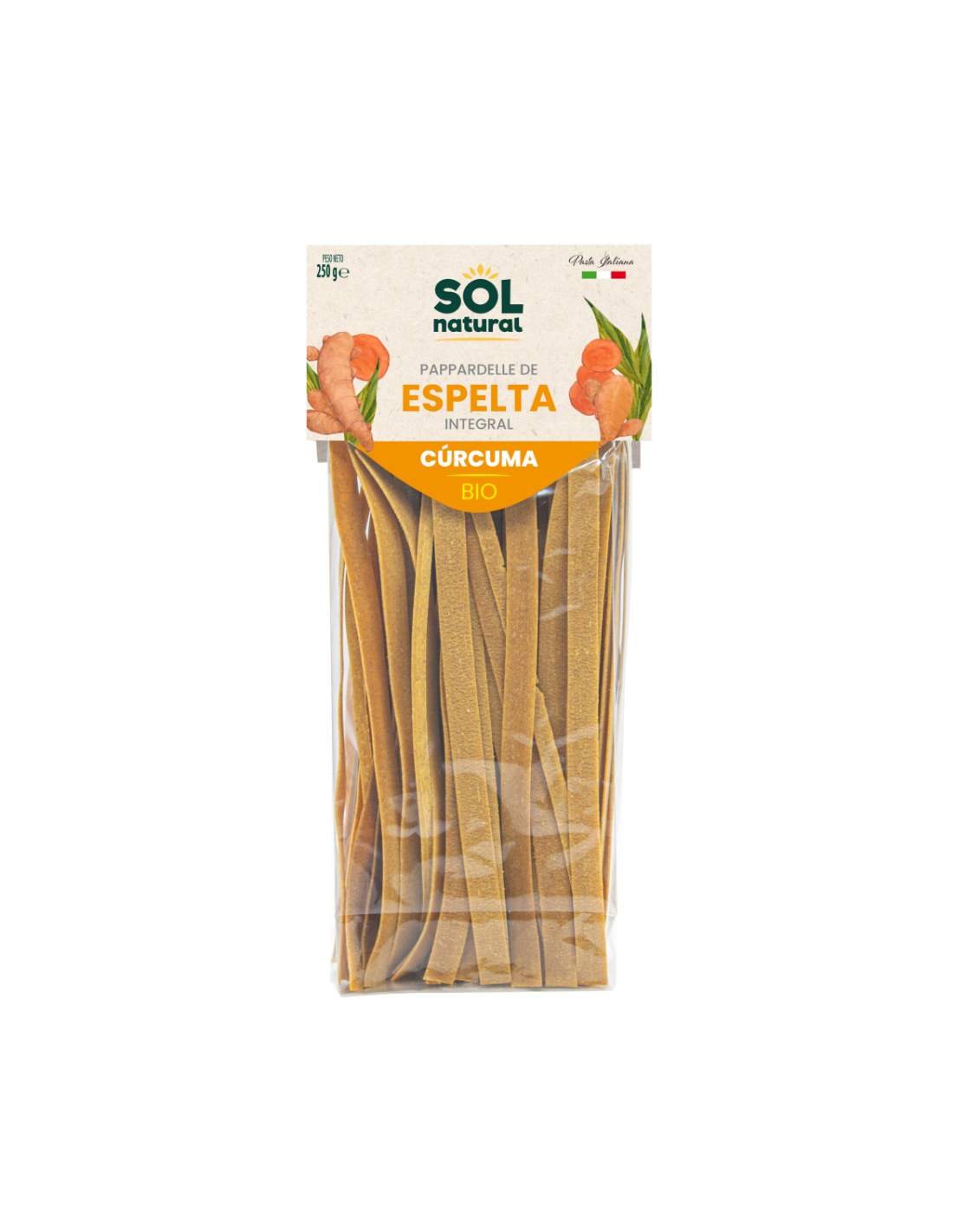 Disfruta de una pasta saludable y llena de sabor con los Papardelle de Espelta Integral con Cúrcuma Bio de SOLNATURAL. Elaborados con ingredientes 100% orgánicos, combinan la textura suave de la espelta integral con el toque natural y antioxidante de la cúrcuma. Perfectos para quienes buscan una opción nutritiva y deliciosa en su dieta diaria. Su formato de 250 g es ideal para preparar platos caseros rápidos y llenos de energía. Añade un toque especial y saludable a tus recetas con SOLNATURAL.
