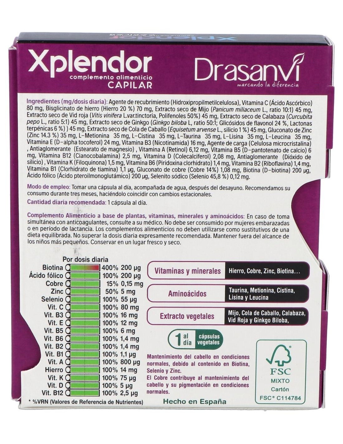 Xplendor aporta 13 vitaminas en cantidad adecuada, cubriendo el 100% de la Cantidad Diaria Recomendada. El cabello es una de las partes del organismo que más rápidamente nota un déficir de vitaminas. Un aporte adecuado contribuye al mantenimiento de la piel en condiciones normales.Xplendor incorpora extractos vegetales con diferentes principios activos: entre estos extractos está el de Mijo. Se trata de un cereal muy rico en nutrientes, proteínas vegetales, ácidos grasos esenciales, fibra y minerales como el fósforo, magnesio, hierro y gran número de macronutrientes. El extracto empleado es en forma de extracto seco, es decir, multiplica por 5 su equivalencia en planta pulverizada.Composición activa por cápsula: