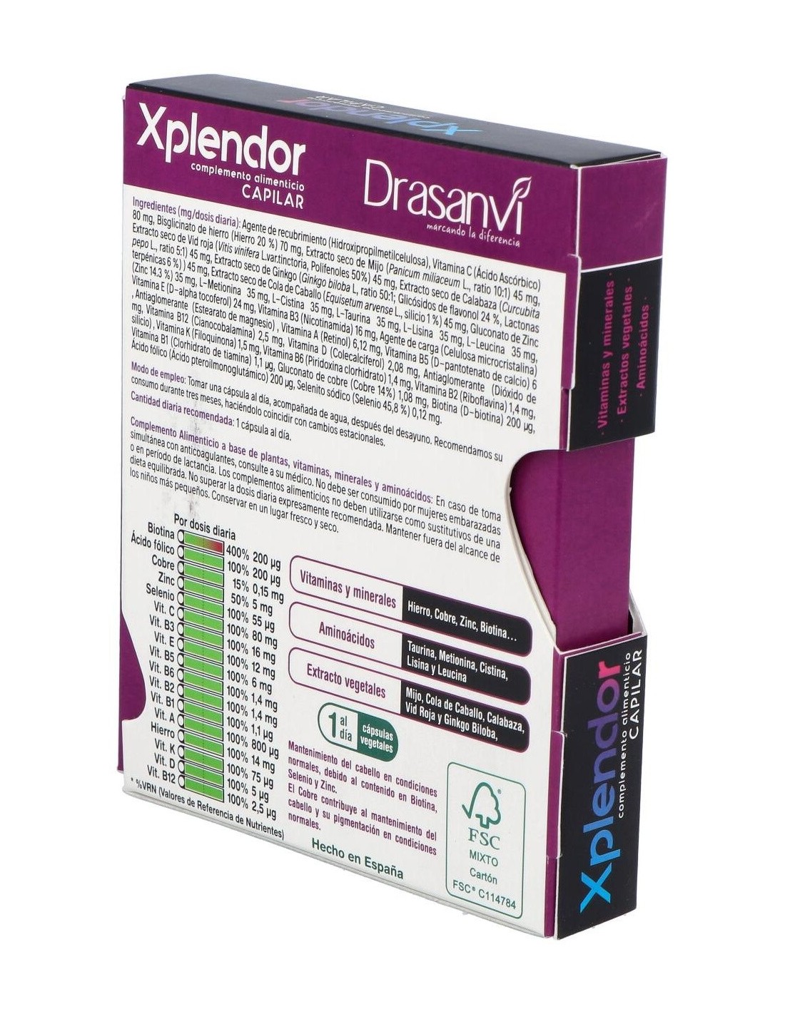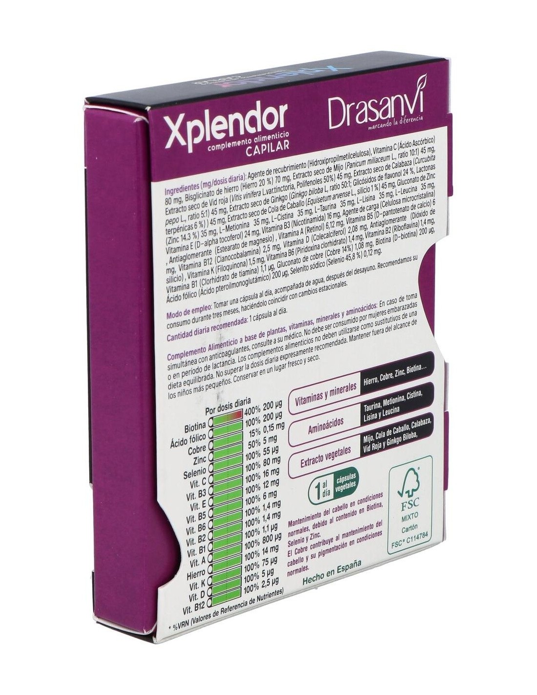 Xplendor aporta 13 vitaminas en cantidad adecuada, cubriendo el 100% de la Cantidad Diaria Recomendada. El cabello es una de las partes del organismo