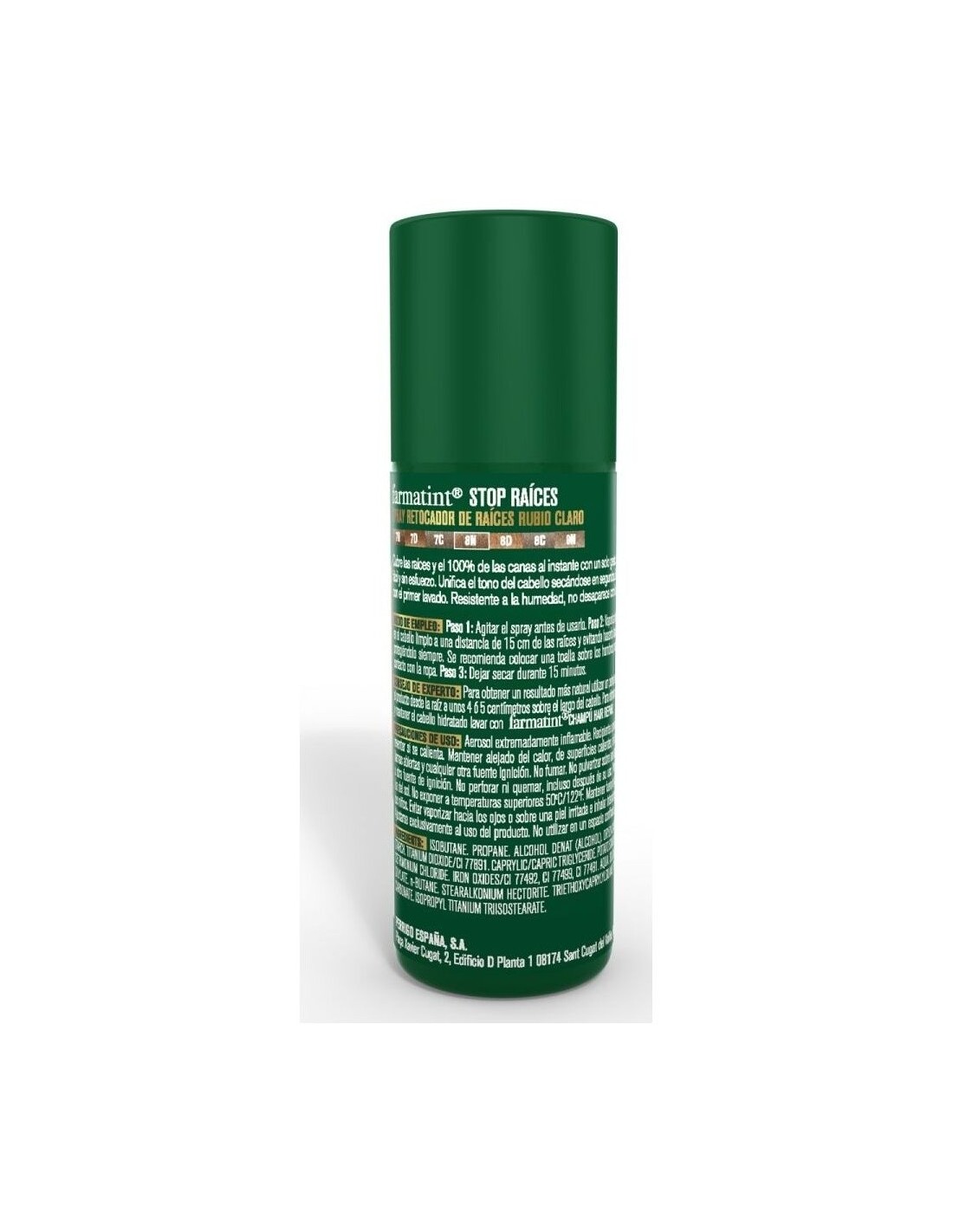 farmatint | Farmatint Stop Raíces Rubio Claro 75 mlFarmatint Stop Raíces Rubio Claro 75 ml spray capilar que cubre las raíces y las canas del cabello de una manera fácil y eficaz. Unifica el tono del cabello en un mismo color.