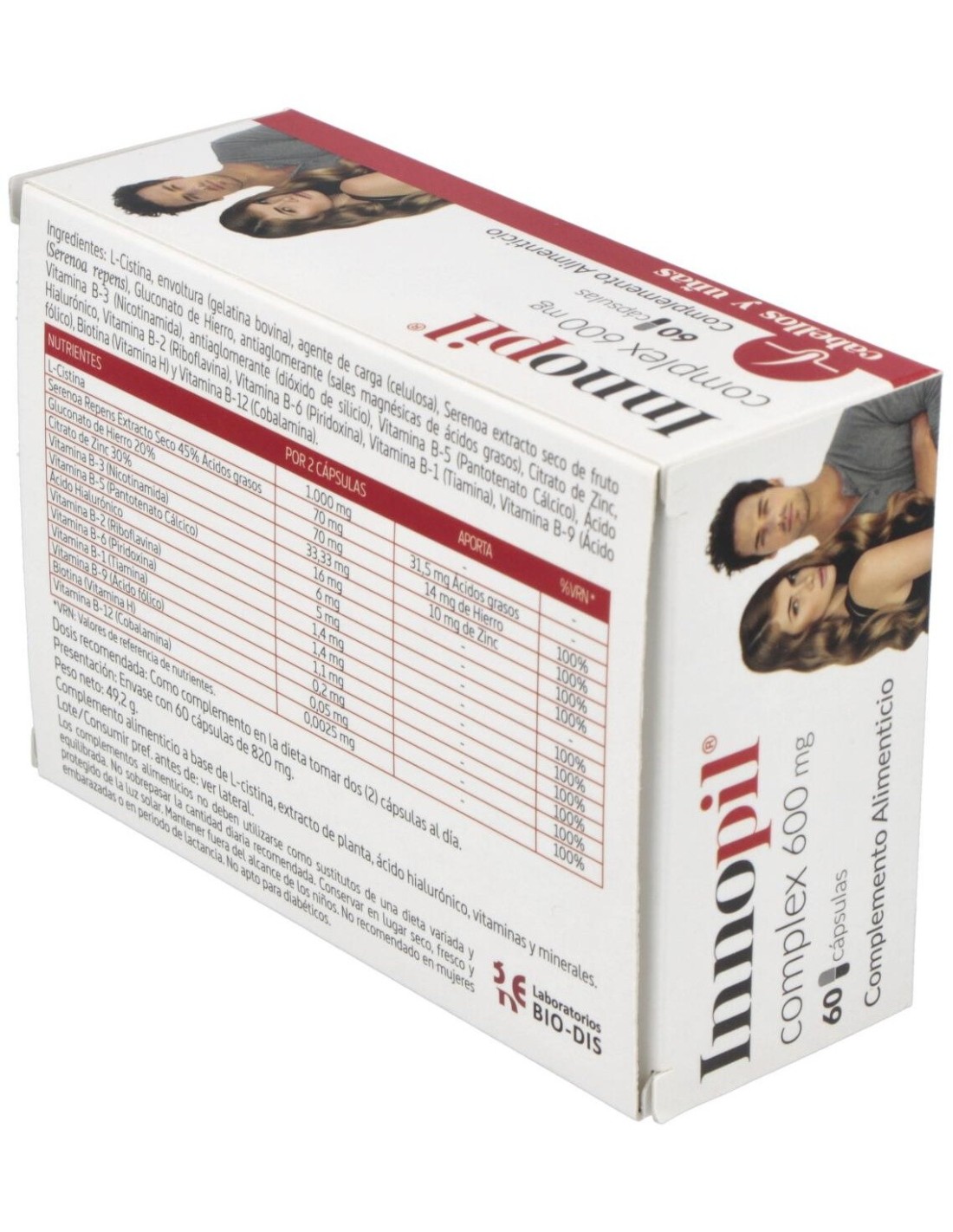 L-Cistina 500 mg, Agente de carga (Celulosa Microcristalina), Serenoa Extracto Seco 35 mg (Serenoa repens), Gluconato de Hierro 20% 35 mg, Antiaglomerante (Estearato de Magnesio Vegetal), Citrato de Zinc 30% 16,67 mg, Vitamina B-3 (Nicotinamida) 8 mg, Antiaglomerante (Dióxido de Silicio), Vitamina B-5 (Pantotenato Cálcico) 3 mg, Ácido Hialurónico 2,5 mg, Vitamina B-2 (Riboflavina) 0,7 mg, Vitamina B-6 (Piridoxina) 0,7 mg, Vitamina B-1 (Tiamina) 0,55 mg, Vitamina B-9 (Ácido fólico) 0,1 mg, Biotina (Vitamina H) 0,025 mg, Vitamina B-12 (Cobalamina) 1,25 µg y Envoltura (Gelatina).