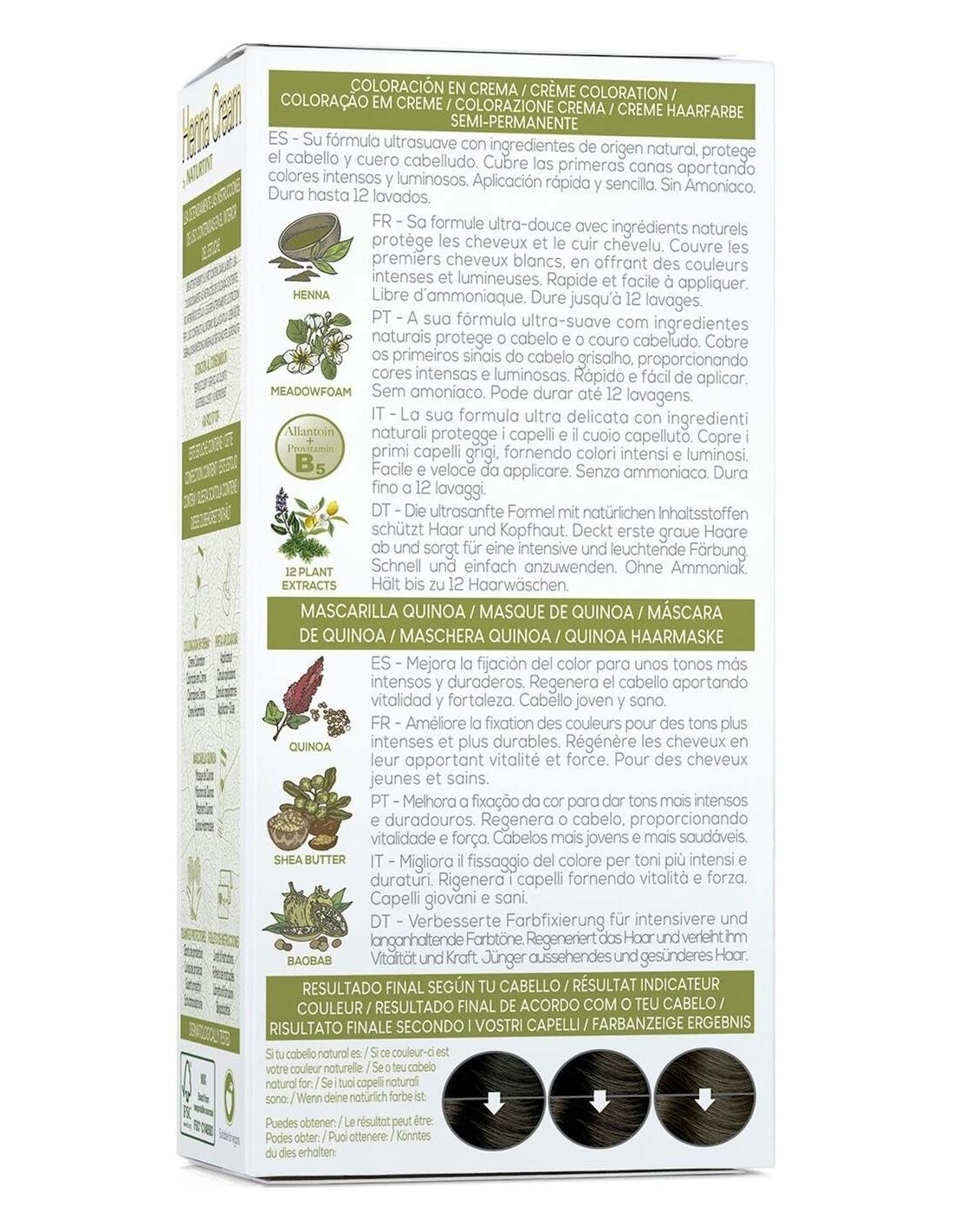 HENNA CREAM COLOURANT 60 ml: AQUA (PURIFIED WATER). BUTYLENE GLYCOL COCOATE. CETYL ALCOHOL. PROPANEDIOL. TRIETHANOLAMINE. PEG-2 DIMEADOWFOAMAMIDOETHYLMONIUM METHOSULFATE. CETEARYL ALCOHOL. GLYCERIN. LAWSONIA INERMIS LEAF EXTRACT. ROSMARINUS OFFICINALIS LEAF EXTRACT. CHAMOMILLA RECUTITA FLOWER EXTRACT. ARNICA MONTANA FLOWER EXTRACT. LAMIUM ALBUM EXTRACT. SALVIA OFFICINALIS LEAF EXTRACT. PINUS SYLVESTRIS BUD EXTRACT. NASTURTIUM OFFICINALE EXTRACT. ARCTIUM MAJUS ROOT EXTRACT. CITRUS LIMON PEEL EXTRACT. HEDERA HELIX LEAF EXTRACT. CALENDULA OFFICINALIS FLOWER EXTRACT. TROPAEOLUM MAJUS FLOWER EXTRACT. PANTHENOL. ALLANTOIN. HEXYLENE GLYCOL. CETEARETH-20. HYDROXYETHYLCELLULOSE. LAURETH-3. TETRASODIUM GLUTAMATE DIACETATE. PARFUM. SODIUM BENZOATE. POTASSIUM SORBATE. BASIC BLUE 99. BASIC YELLOW 57. BASIC BROWN 17. BASIC RED 76. CITRIC ACID. BENZYL SALICYLATE. LIMONENE. HEXYL CINNAMAL. LINALOOL.