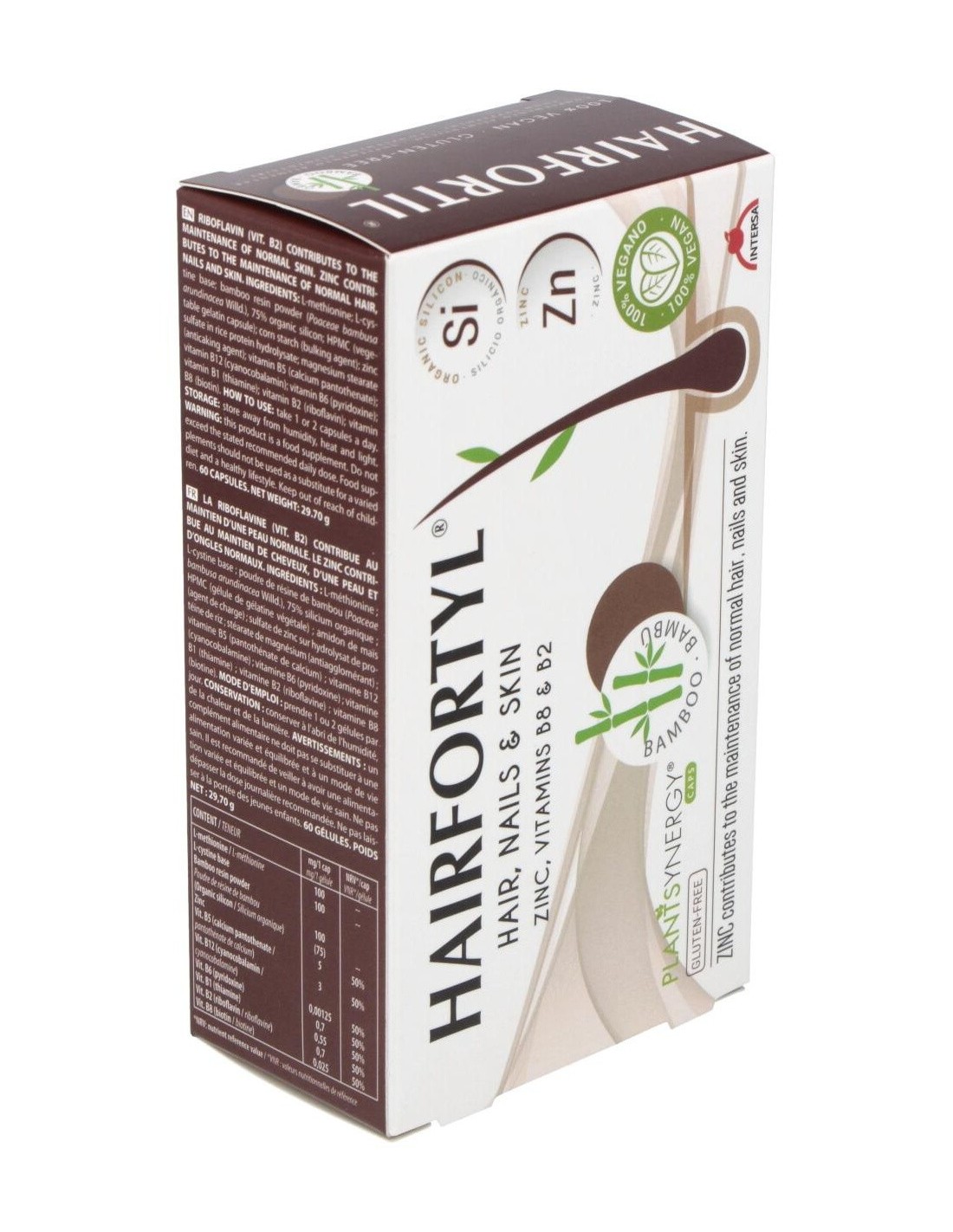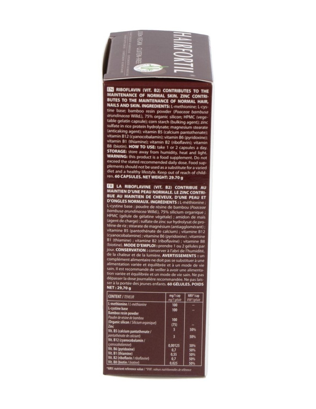 Cerebell también asegura el mantenimiento de la tersura de la piel. El zinc contribuye al metabolismo de los glúcidos, las proteínas y posee un rol preventivo anti-caída, además de un efector protector antioxidante celular que previene la aparición de arrugas. Ingredientes:L-metionina. L-cistina base, polvo de resina de bambú, 75% silicio orgánico, HPMC (cápsula de gelatina vegetal); almidón de maíz (Incrementador de volumen); sulfato de zinc en hidrolizado de proteina de arroz; estearato de magnesio (antiaglomerante); vitamina b5 (pantotenato de calcio); vitamina b12 (cianocobalamina); vitamina b6 (piridoxina); vitamina b1 (tiamina); vitamina B12 (ribofalvina); vitamina B8 (biotina). Modo de empleo:Tomar de 1 a 2 cápsulas al día. Presentación:Envase de 60 cápsulas.