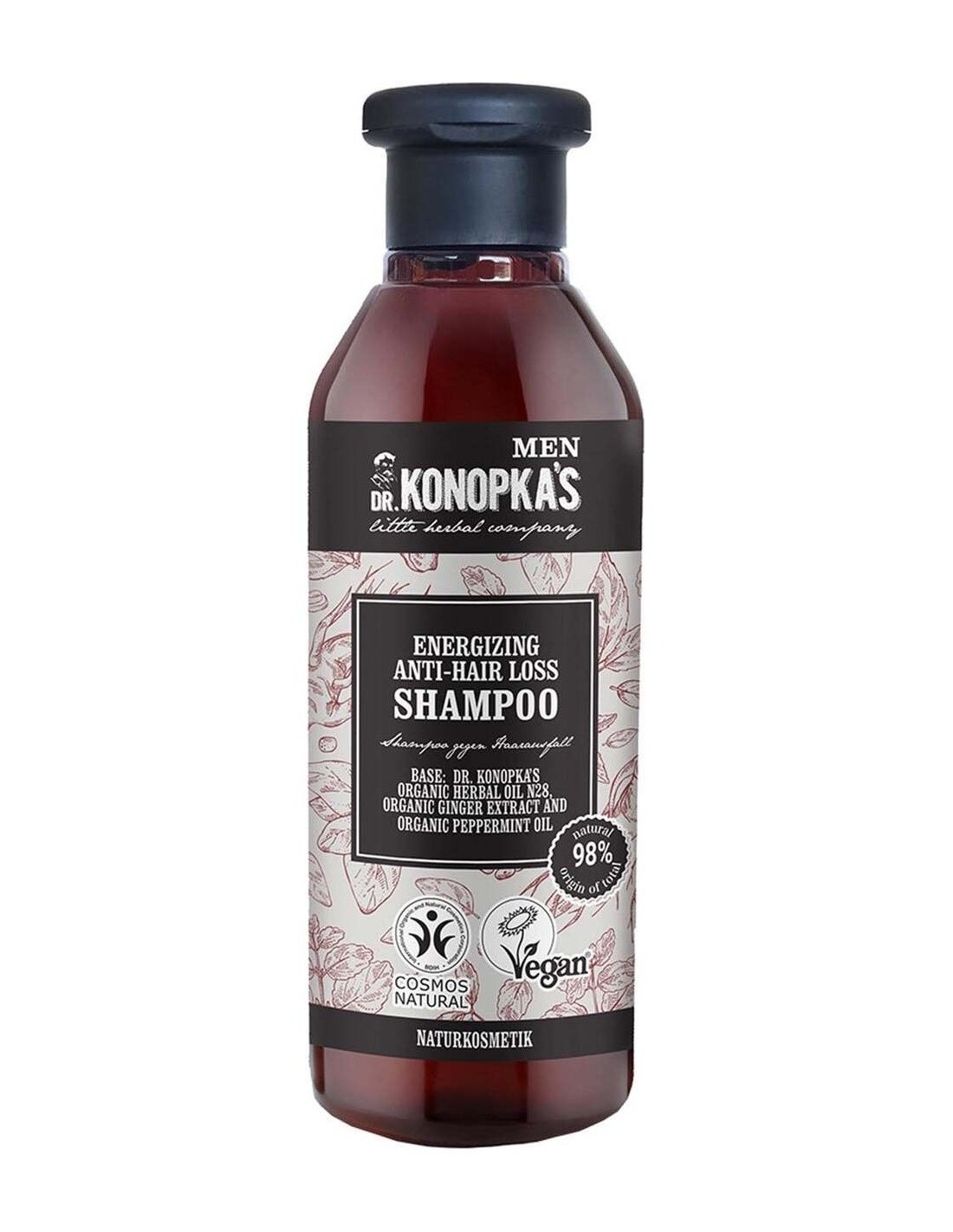 DR. KONOPKA´SEste champú contiene una poderosa mezcla del aceite de hierbas orgánico n.º 28 del Dr. Konopka, extracto de jengibre orgánico y aceite de menta piperita orgánico.\ Energiza el cuero cabelludo, ayuda a controlar la caída capilar y nutre el cabello desde las raíces para dejarlo más fuerte, grueso y sano. Certificado BDIH Cosmos Natural y Vegan.