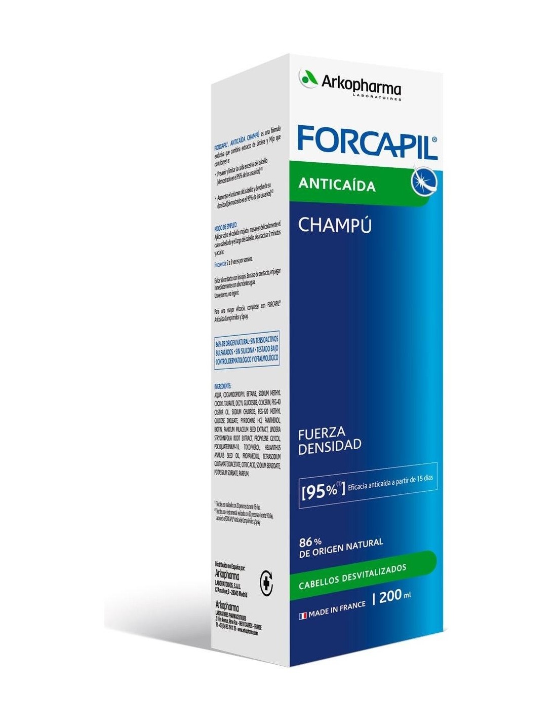 ARKOPHARMAUna fórmula con un 86% de ingredientes de origen natural, que brinda fuerza y densidad al cabello, ideal para cabellos desvitalizados. Forcapil® Anticaída Champú combina extracto de Lindera, Mijo, Vitamina B6 y B8, y Provitamina B5, que contribuye a prevenir y limitar la caída excesiva del cabello y a aumentar el volumen del cabello y devolverle su densidad.
