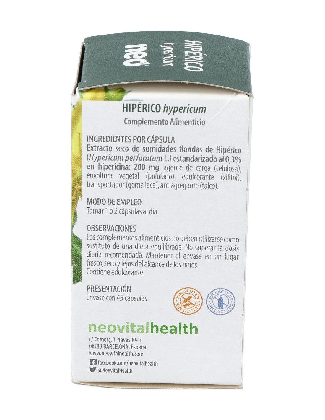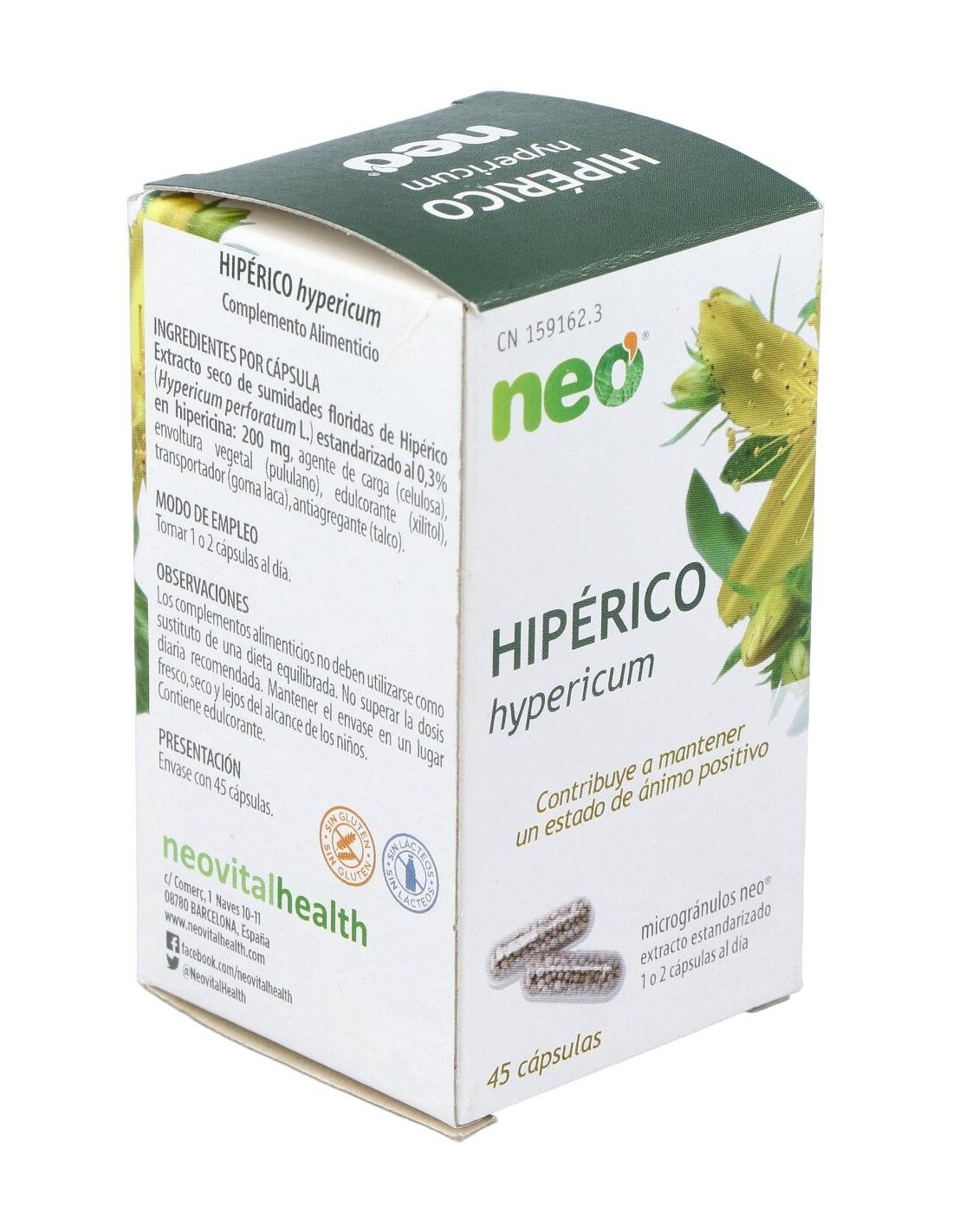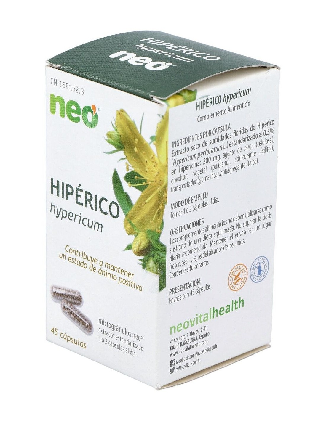 Neo | Neovital Hiperico 45cápsEl ritmo de vida actual, problemas en el trabajo o simplemente el estrés, pueden afectar a nuestro estado de ánimo. Neovital Hiperico es un complemento alimenticio a base de Hypericum perforatum que te ayudará a combatir estos momentos.