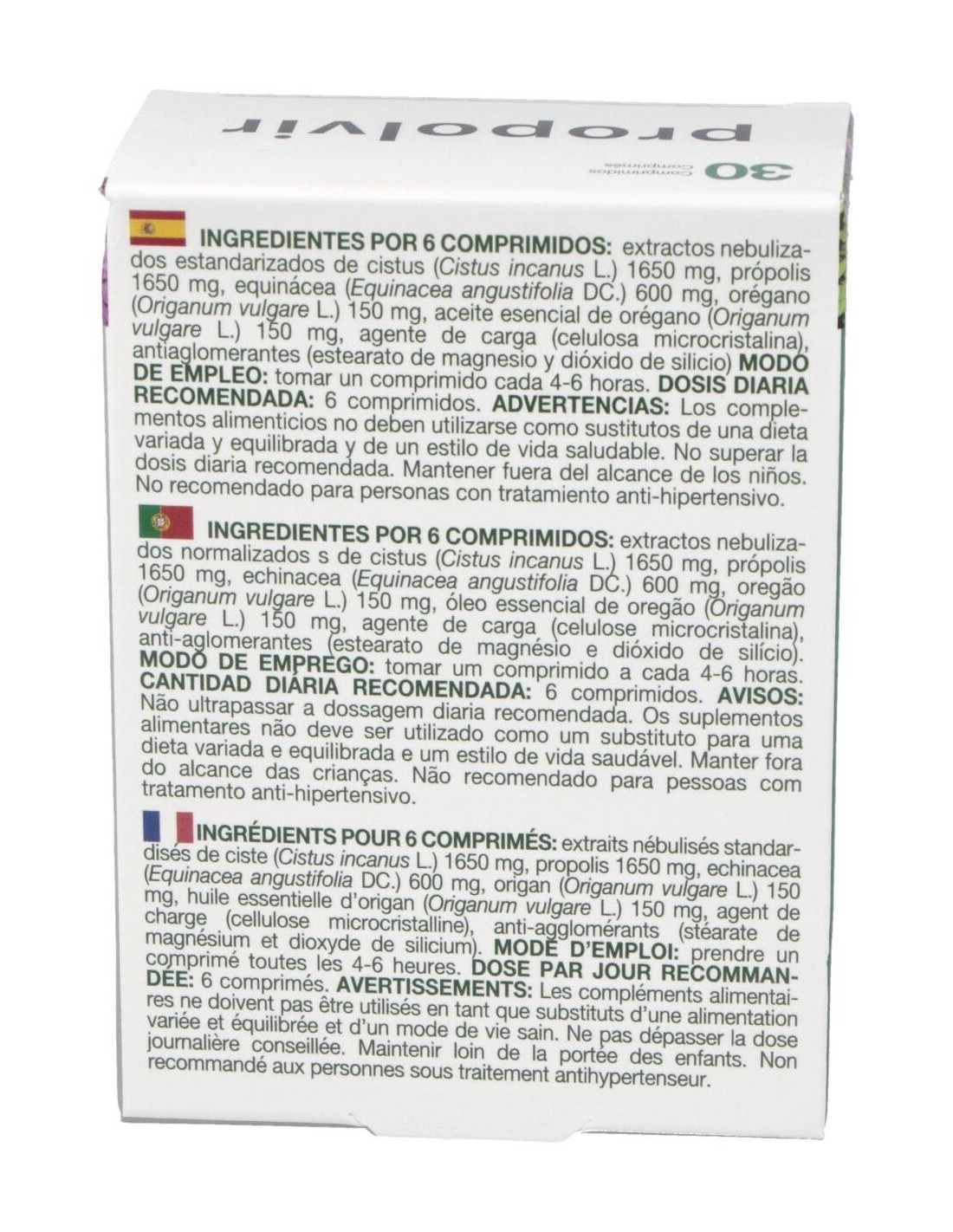 Los comprimidos de Propolvir están formulados con extractos naturales y otros componentes que cumplen con estándares de calidad. Su presentación en envase de 30 unidades permite un suministro para un periodo determinado, ideal para quienes buscan complementar su dieta habitual con productos de origen natural.