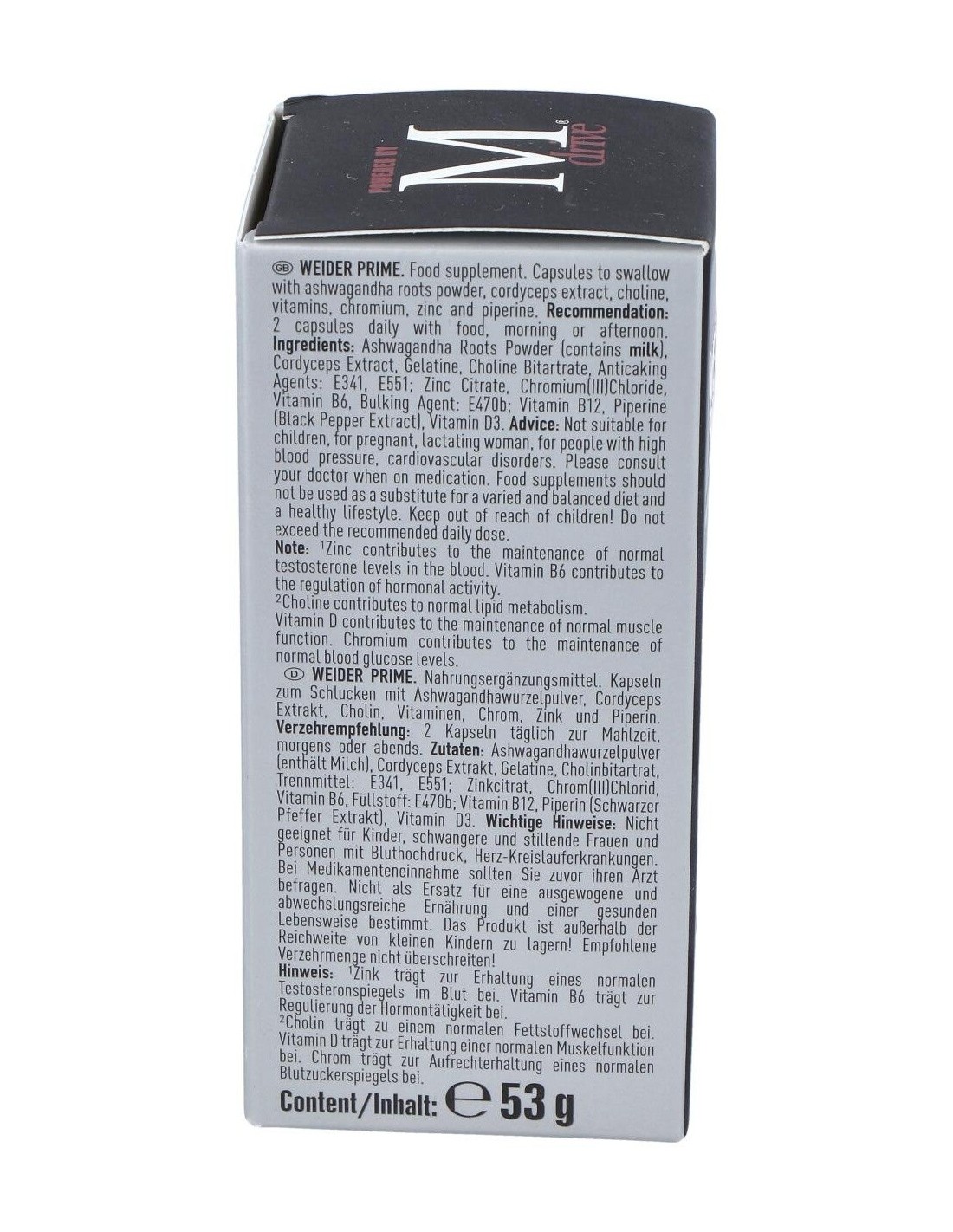 La testosterona es una hormona clave en el desarrollo y mantenimiento de la masa muscular, Weider Prime cuenta con una fórmula adecuada que ayuda a disminuir los efectos del estrés y los factores externos sobre la producción natural de testosterona y además proporciona los nutrientes necesarios en la producción de la misma.