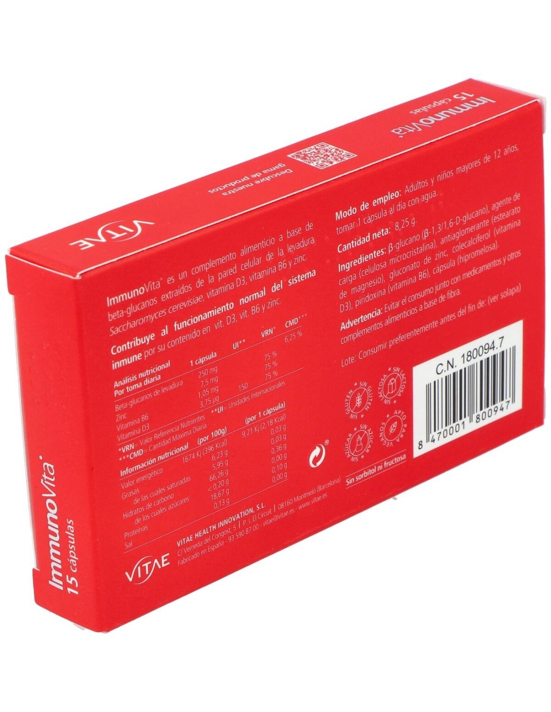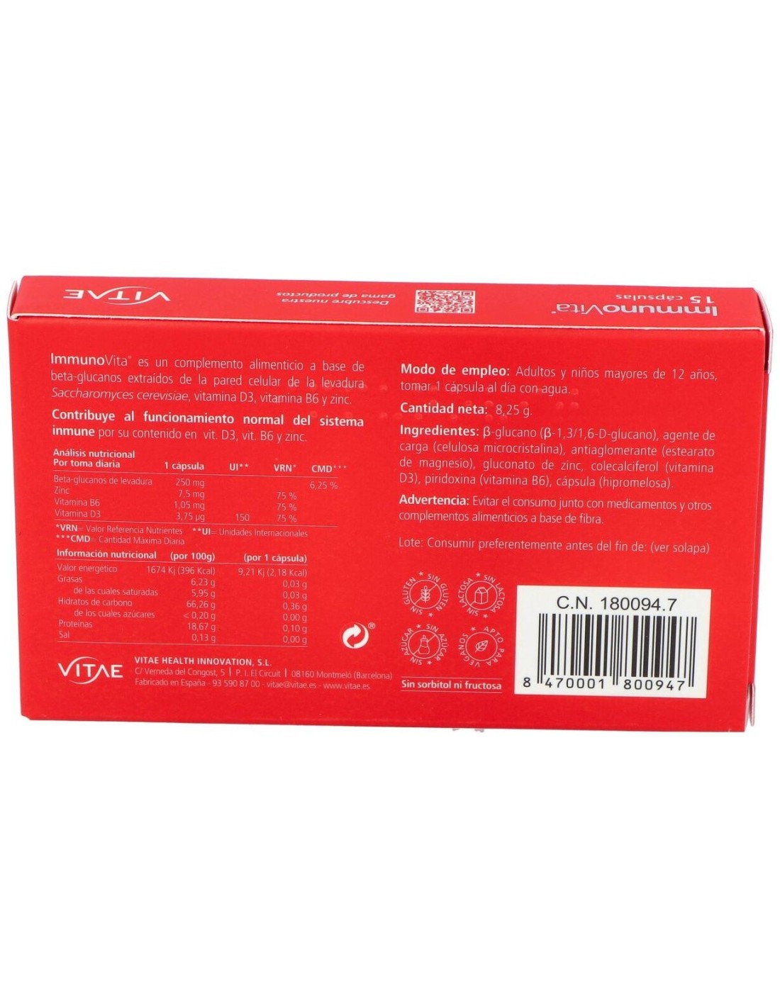 Vitae Immunovita 15 cápsulas es un suplemento con betaglucanos purificados de la levadura Saccharomyces cerevisiae, vitamina D3, vitamina B6 y zinc. Contribuye al funcionamiento normal del sistema inmunitario, ayuda a disminuir el cansancio y la fatiga y protege las células frente al daño oxidativo. Indicado para adultos y niños mayores de 12 años.