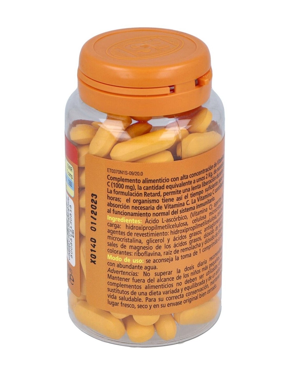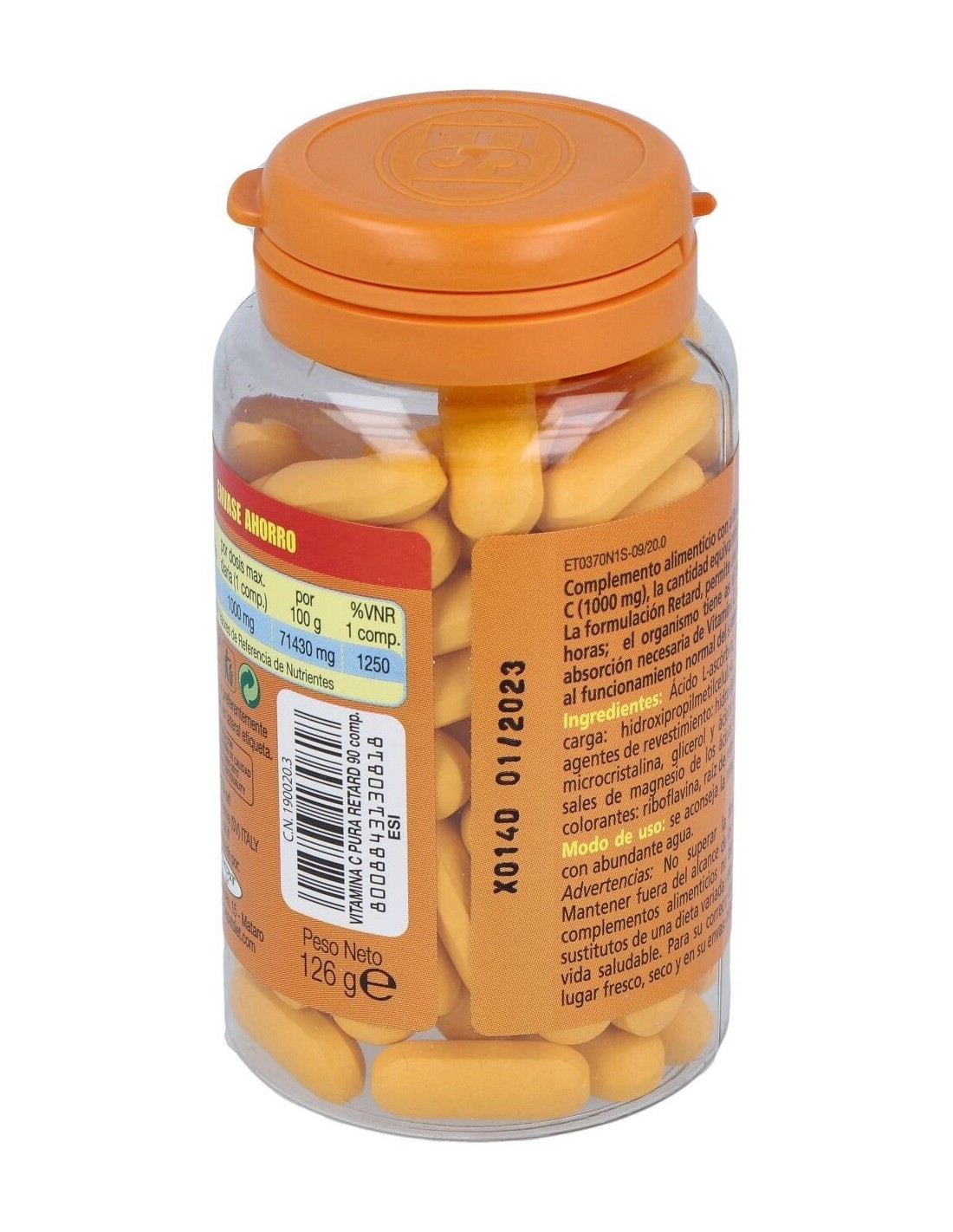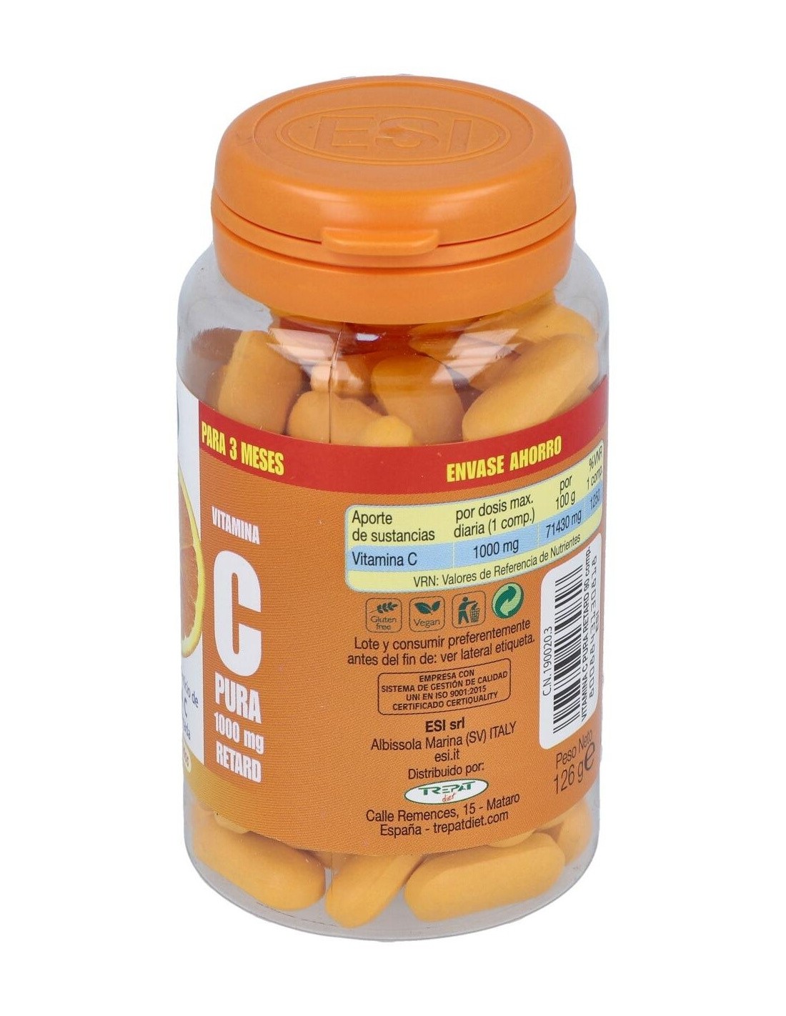 ESI Vitamina C Pura Retard 1000mg 90comp es un complemento alimenticio de vitamina C de liberación prolongada, que actúa durante 3 horas para que el organismo pueda absorber la cantidad necesaria. Contiene una alta dosificación de vitamina C, equivalente de 2 kg de naranjas, y está indicada para adultos que tengan déficit de esta vitamina.