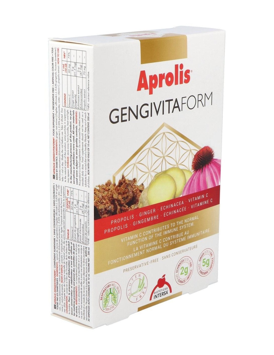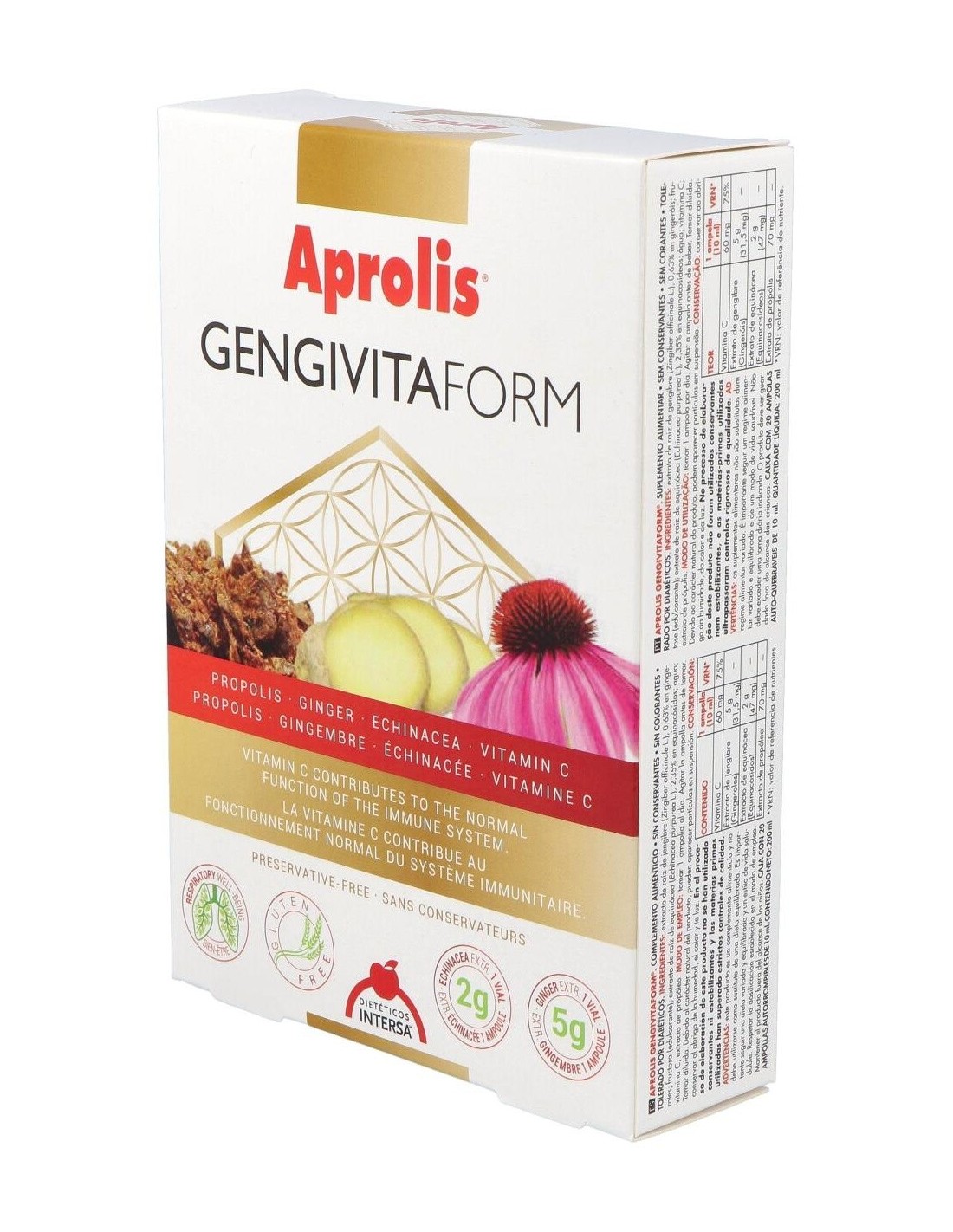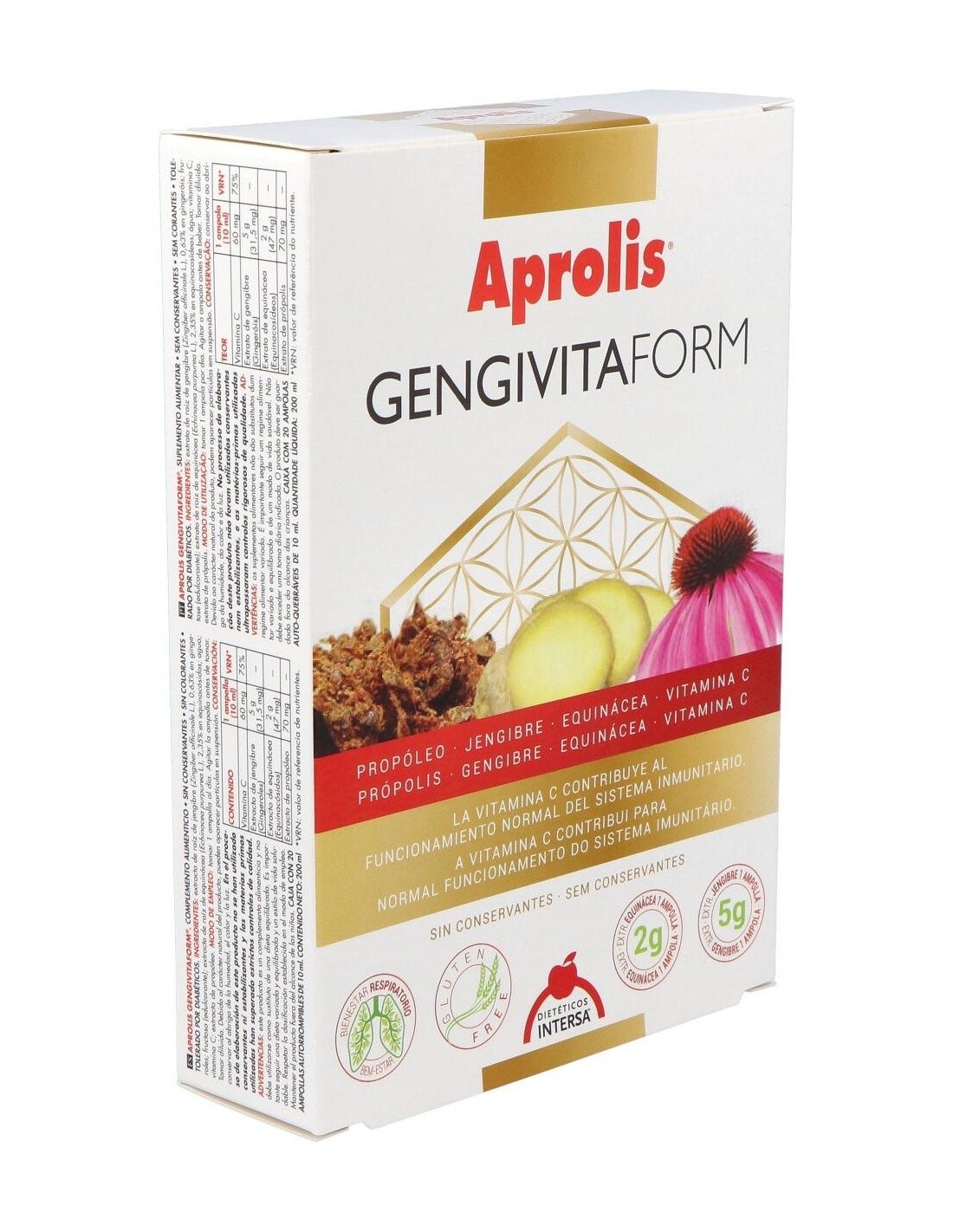 Extractos de: Echinácea (Echinacea purpurea L., 2,35% en equinacósidos) y Jengibre (Zingiber officinale L., 0,63% en gingeroles).