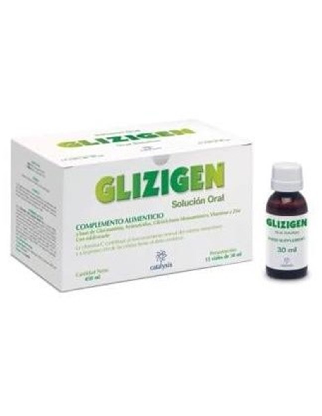 GLIZIGENComplemento nutricional con ácido glicirricínico activado, vitaminas, minerales y aminoácidos. Contiene ácido glicirricínico activado y vitaminas y minerales. El Zinc, vitaminas C, B6 y B12 contribuyen al funcionamiento normal del sistema inmune. Zinc y vitamina C ayudan al mantenimiento de una piel normal y protegen frente al estrés oxidativo.\ \ El producto Glizigen solución oral se ha desarrollado para apoyar el normal mantenimiento de la piel y del sistema inmune, gracias a que contiene una variedad de vitaminas, como la vitamina C, que contribuye a mantener el normal funcionamiento del sistema inmunológico y a proteger las células frente al daño oxidativo, así como el Zinc, que ayuda a la normal función de la piel.\ En resumen, Glizigen es un producto con una composición altamente mejorada, para aquellos que buscan ayudar, así como aportando nutrientes para dar apoyo a su sistema inmune y al bienestar general.