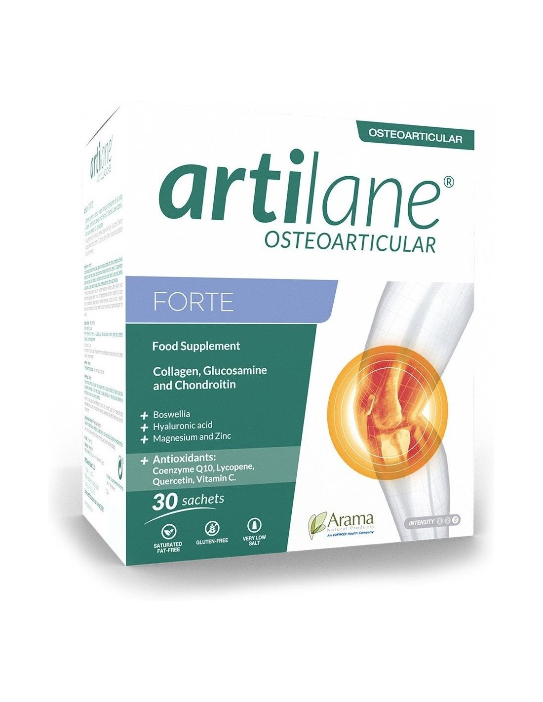 Arama Artilane Forte 30 Sobres es un complemento alimenticio Artilane Forte en formato 30 sobres. El producto contiene extracto de oleorresina de Boswelia y altas dosis de Glucosamina y Condroitina. Además, contiene Ácido hialurónico, Magnesio, Zinc, Boswelia y antioxidantes como la Coenzima Q10, Licopeno, Quercitina y Vitamina C.