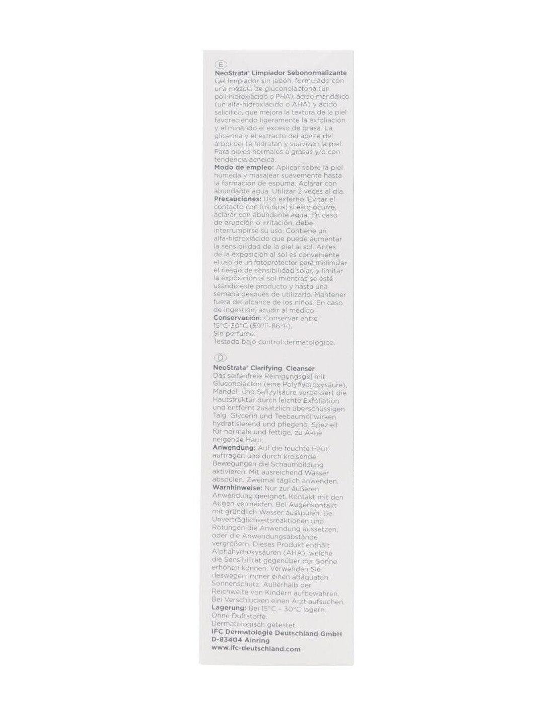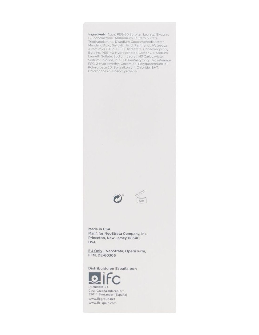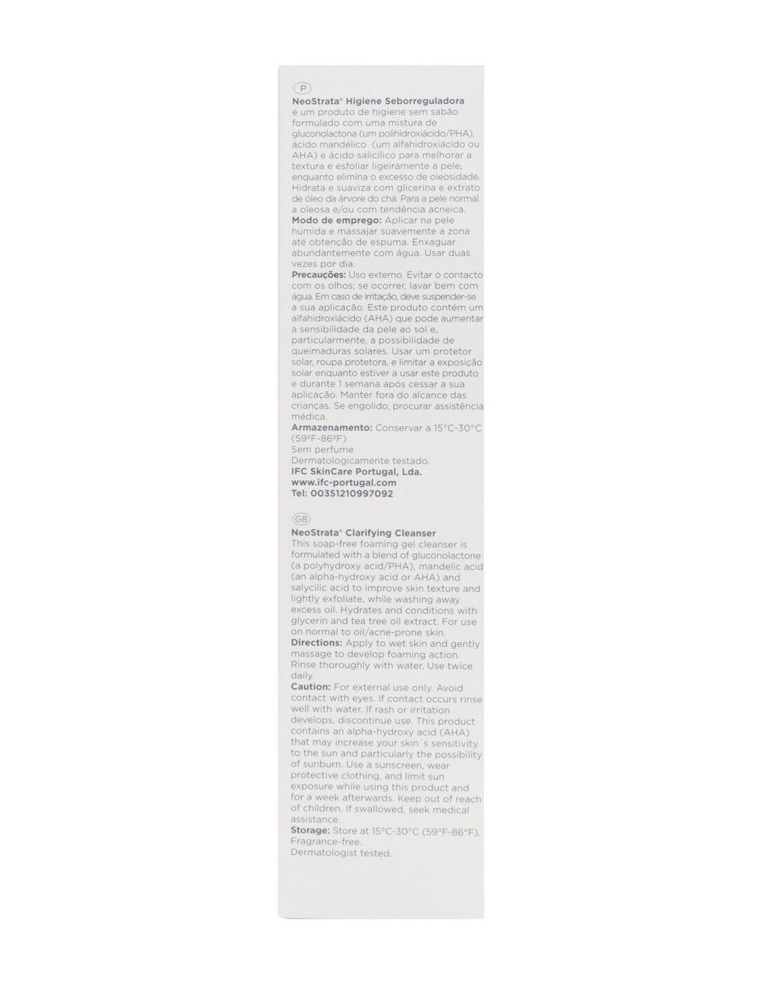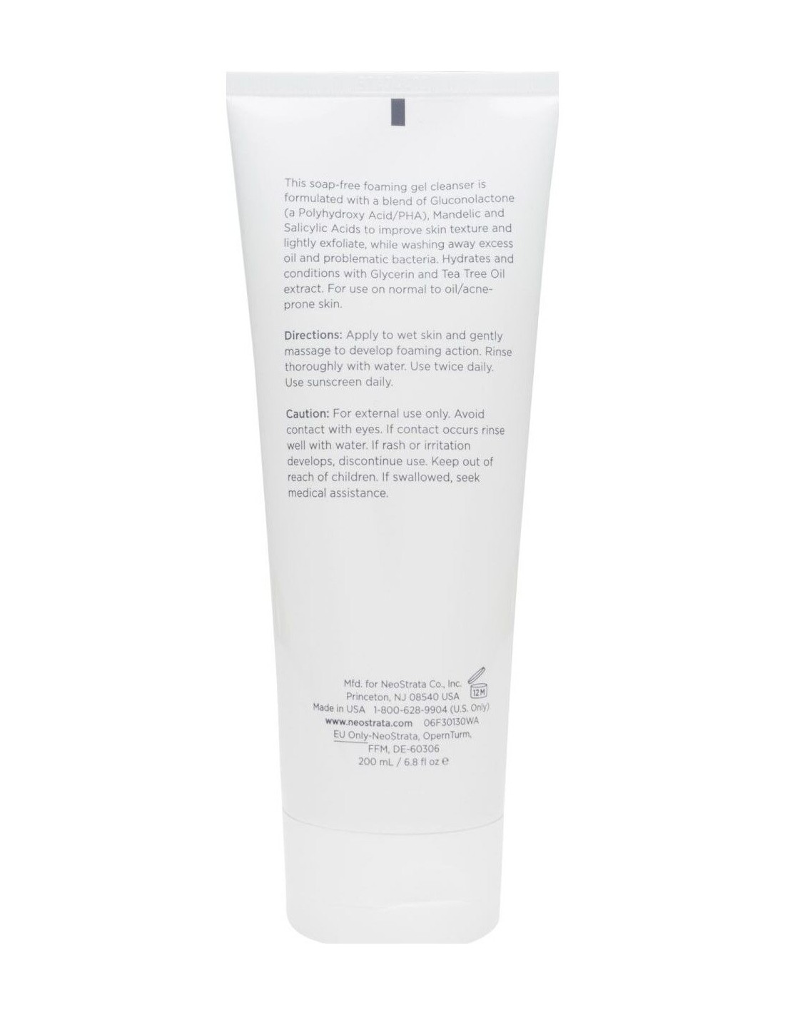 Su fórmula contiene Gluconolactona (un poli-hidroxiácido o PHA), ácido mandélico (un alfa-hidroxiácido o AHA) y ácido salicílico produce una exfoliación suave al mismo tiempo que limpia y elimina el exceso de sebo. La glicerina y al extracto de aceite de árbol de té hidratan y suavizan la piel, por lo que resulta un limpiador de uso diario ideal para todo tipo de pieles y especialmente indicado para pieles normales a grasas y/o con tendencia acneica.
