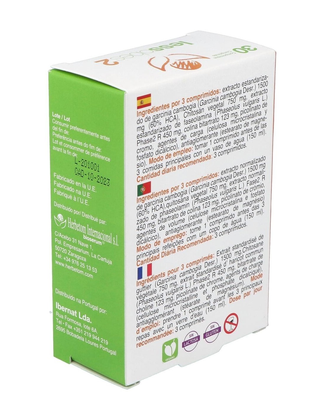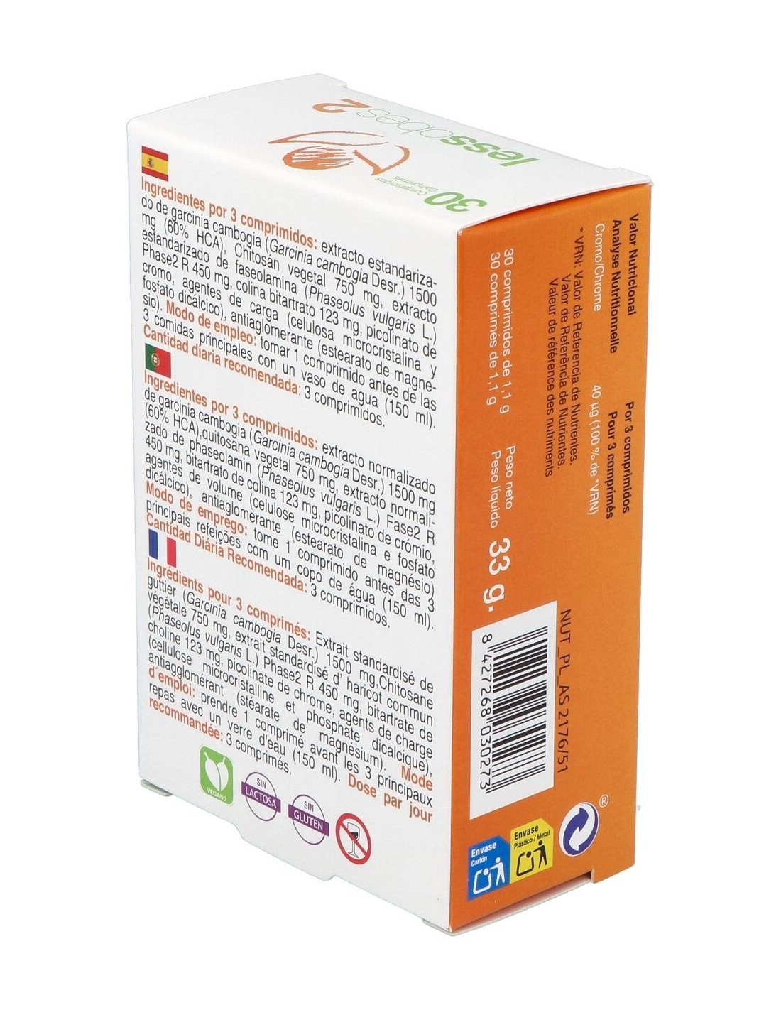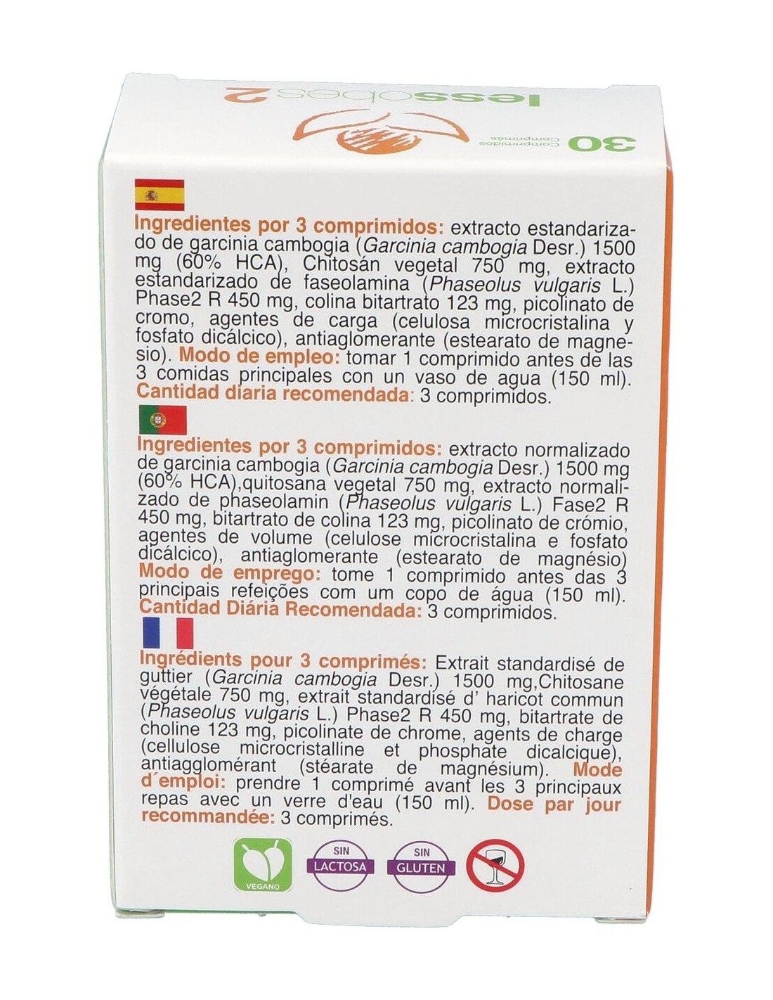 Extracto estandarizado de garcinia cambogia (Garcinia cambogia Desr.) 1500 mg (60% HCA), Chitosán vegetal 750 mg, extracto estandarizado de faseolamina (Phaseolus vulgaris L.)Phase2 R 450 mg, colina bitartrato 123 mg, picolinato de cromo, agentes de carga (celulosa microcristalina y fosfato dicálcico), antiaglomerante (estearato de magnesio).