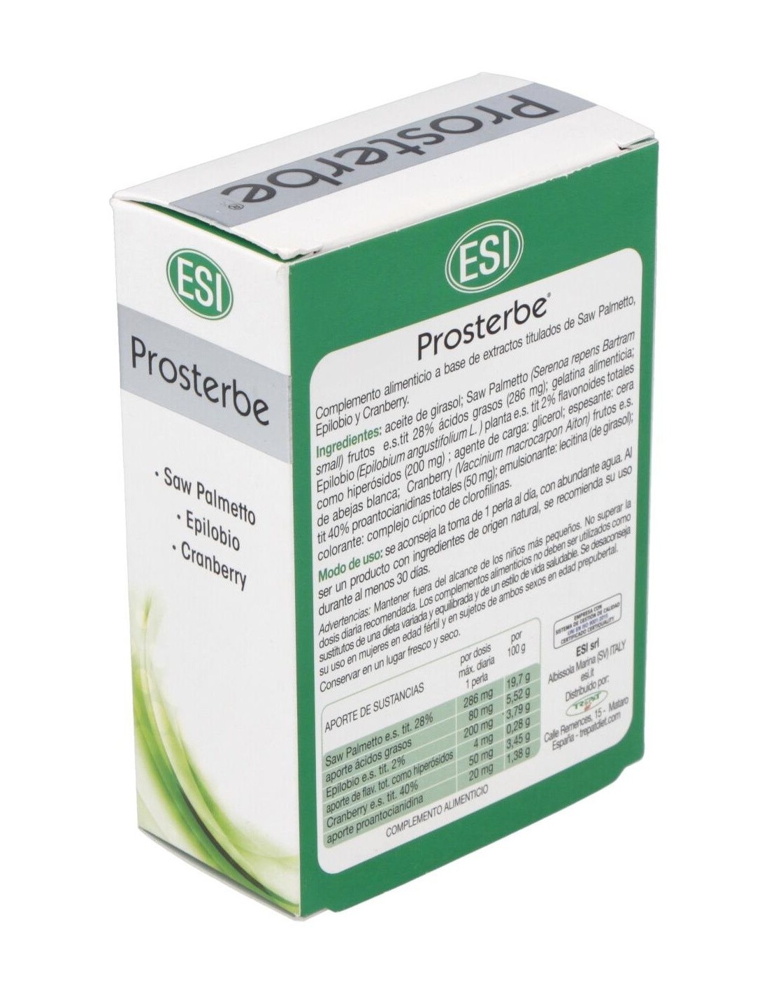 Prosterbe 30prl es un complemento alimenticio que da soporte y mantiene el bienestar de la próstata. Formulado a base de Epilobium, Saw Palmetto y Cranberry (40% de proantocianidinas) que contribuyen a promover el bienestar del tracto urinario.