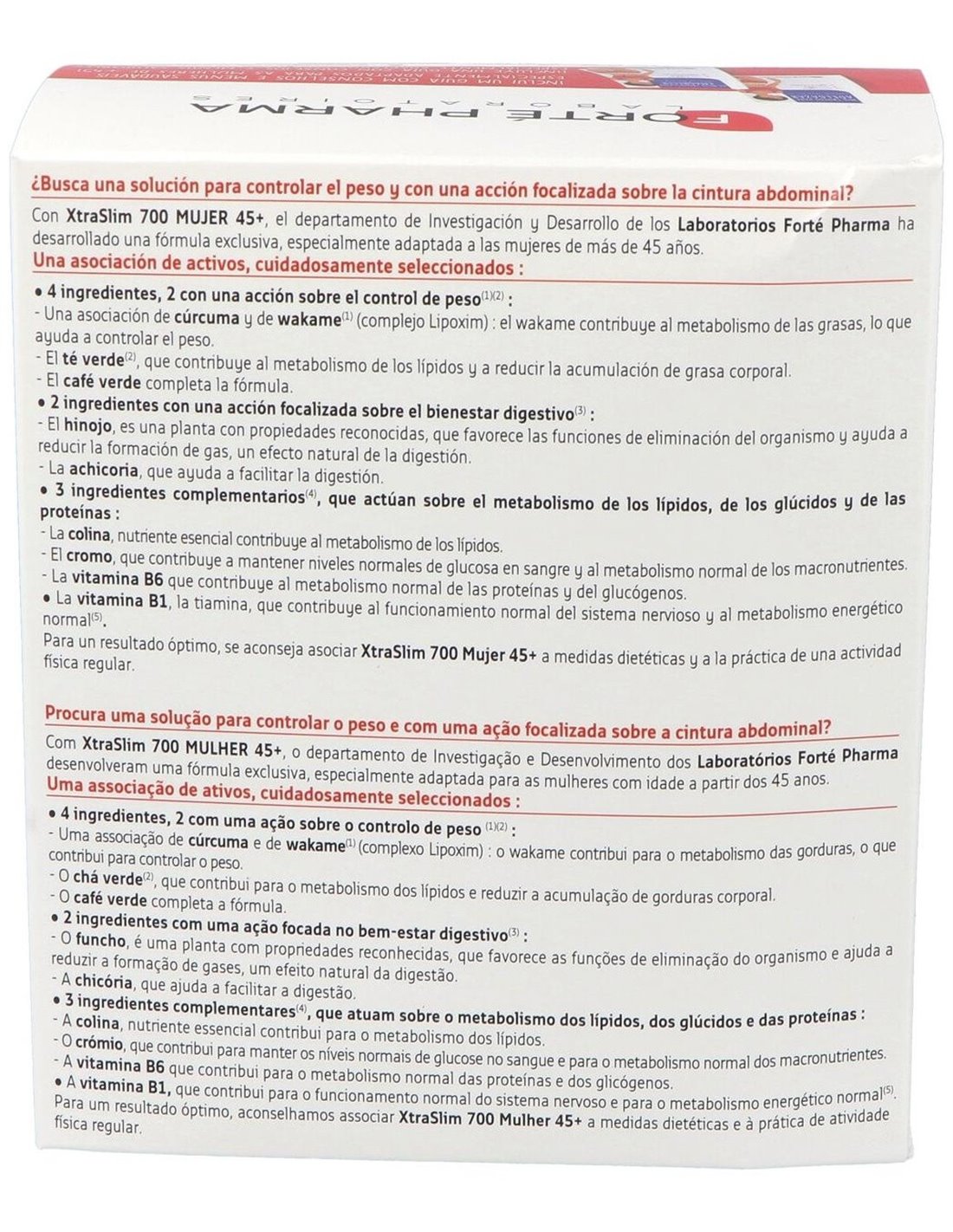 Forté Pharma XtraSlim 700 Mujer 45+ 120caps es un complemento alimenticio a base de activos naturales como la cúrcuma, el té verde o el café verde, que pueden contribuir a la pérdida de peso.