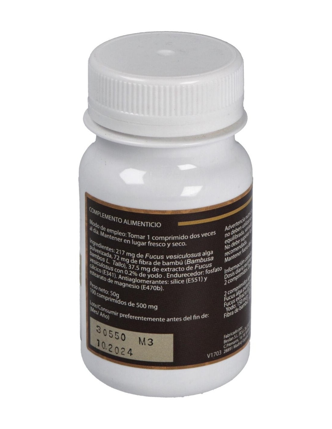 217mg de Fucus vesiculosus alga pulverizada y 45mg de extracto estandarizado con mínimo de 0,05% de yodo.