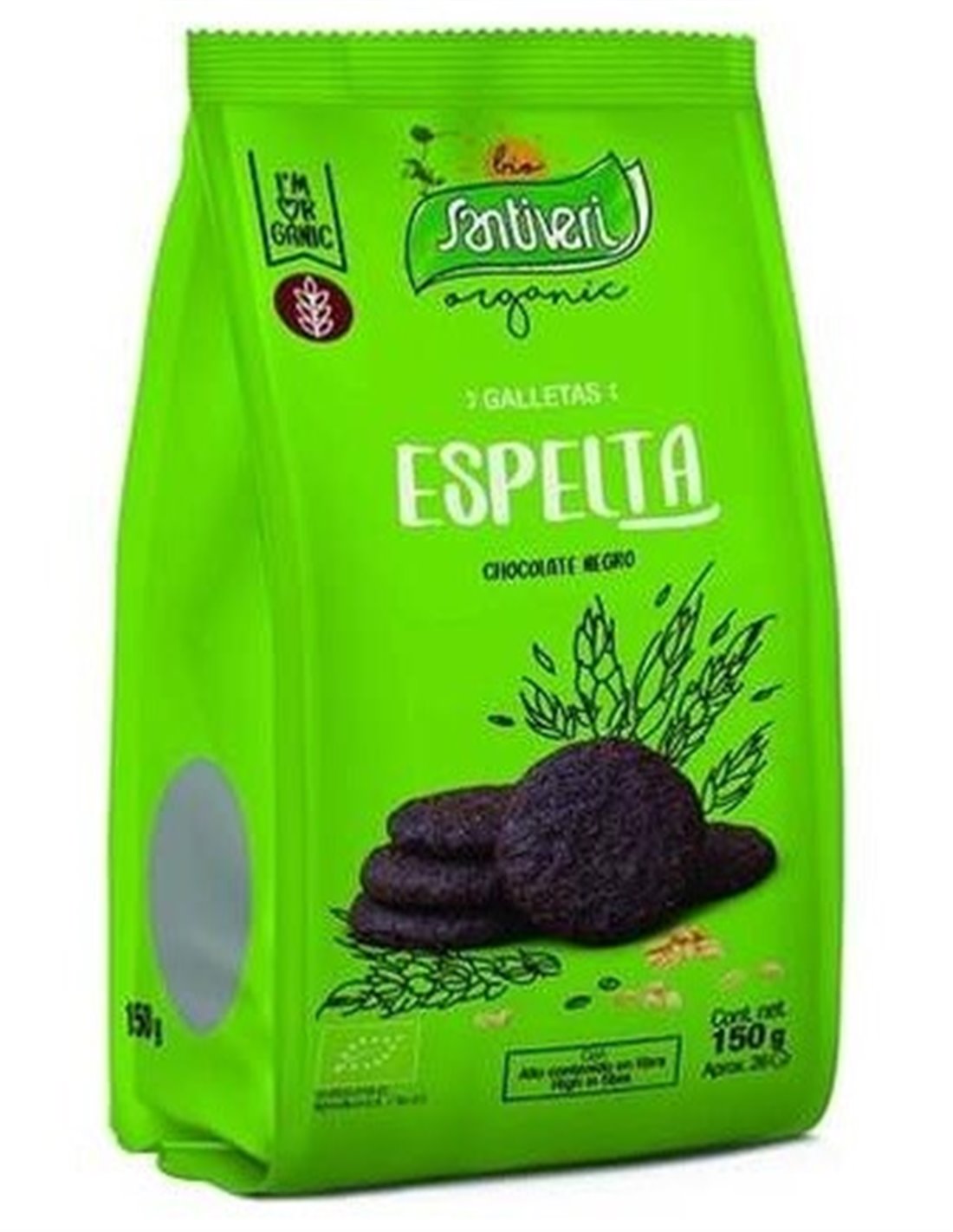 Harina integral de espelta* (variedad del trigo) (62%), azúcar moreno de caña integral*, aceites vegetales (girasol, oliva)* (13%), chocolate negro (pasta de cacao*, azúcar*, manteca de cacao*, vainilla en polvo*) (4%), cacao en polvo* (3%), emulgente (lecitina de girasol*), aromas naturales, sal marina, gasificantes (bicarbonato sódico y bicarbonato amónico), antioxidante (extracto rico en tocoferoles).
