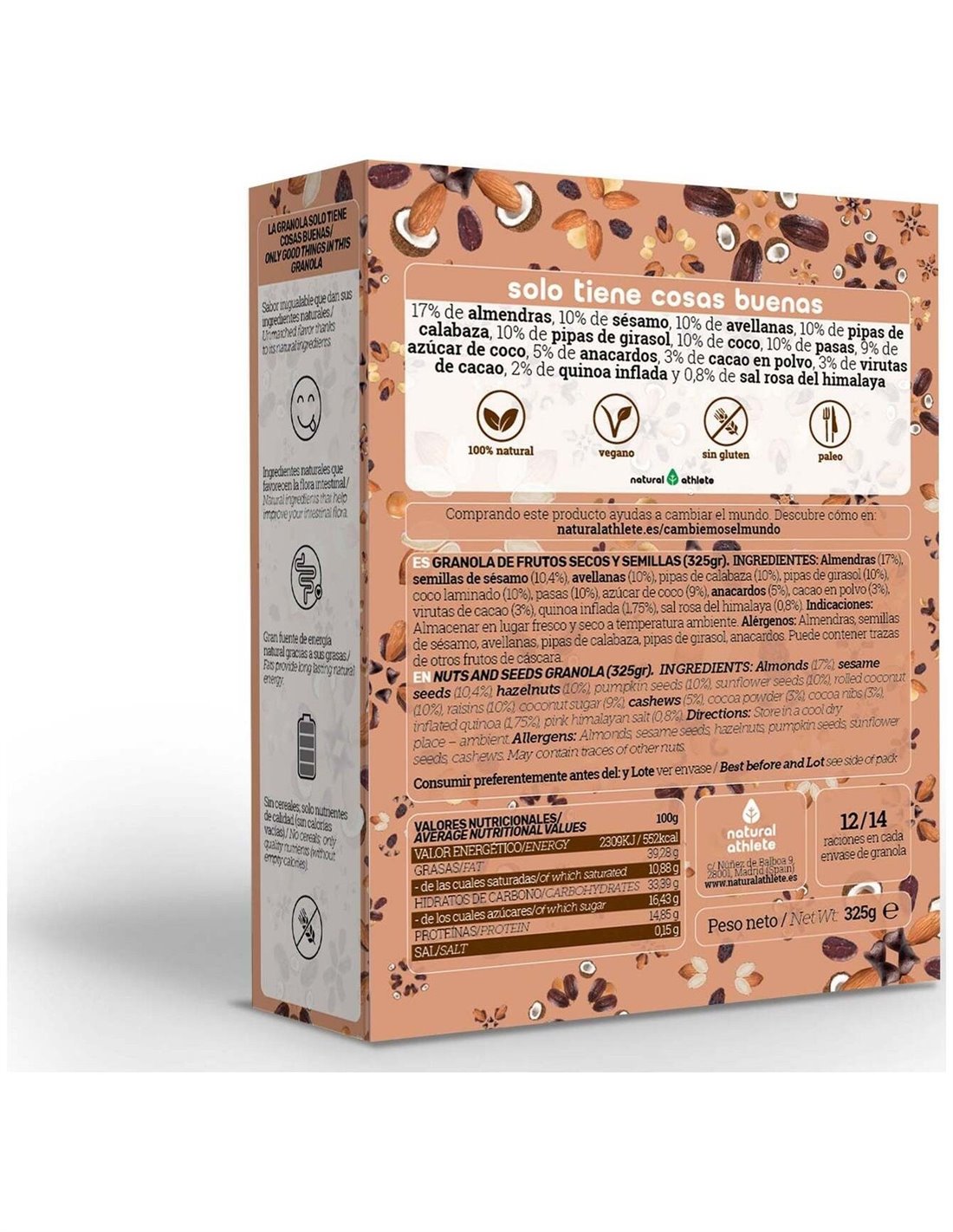 almendras (17%), sésamo (10%), avellanas (10%), pipas de calabaza(10%), pipas de girasol (10%), copos de coco (10%), pasas (10%), sirope de coco(9%), anacardos (5%), cacao en polvo(3%), virutas de cacao(3%), quinoa inflada (2%) y sal rosa del himalaya (0,8%). Procedente de agricultura ecológica. Alérgenos: almendras, semillas de sésamo, avellanas, pipas de calabaza, pipas de girasol y anacardos. Puede contener trazas de otros frutos de cáscara.