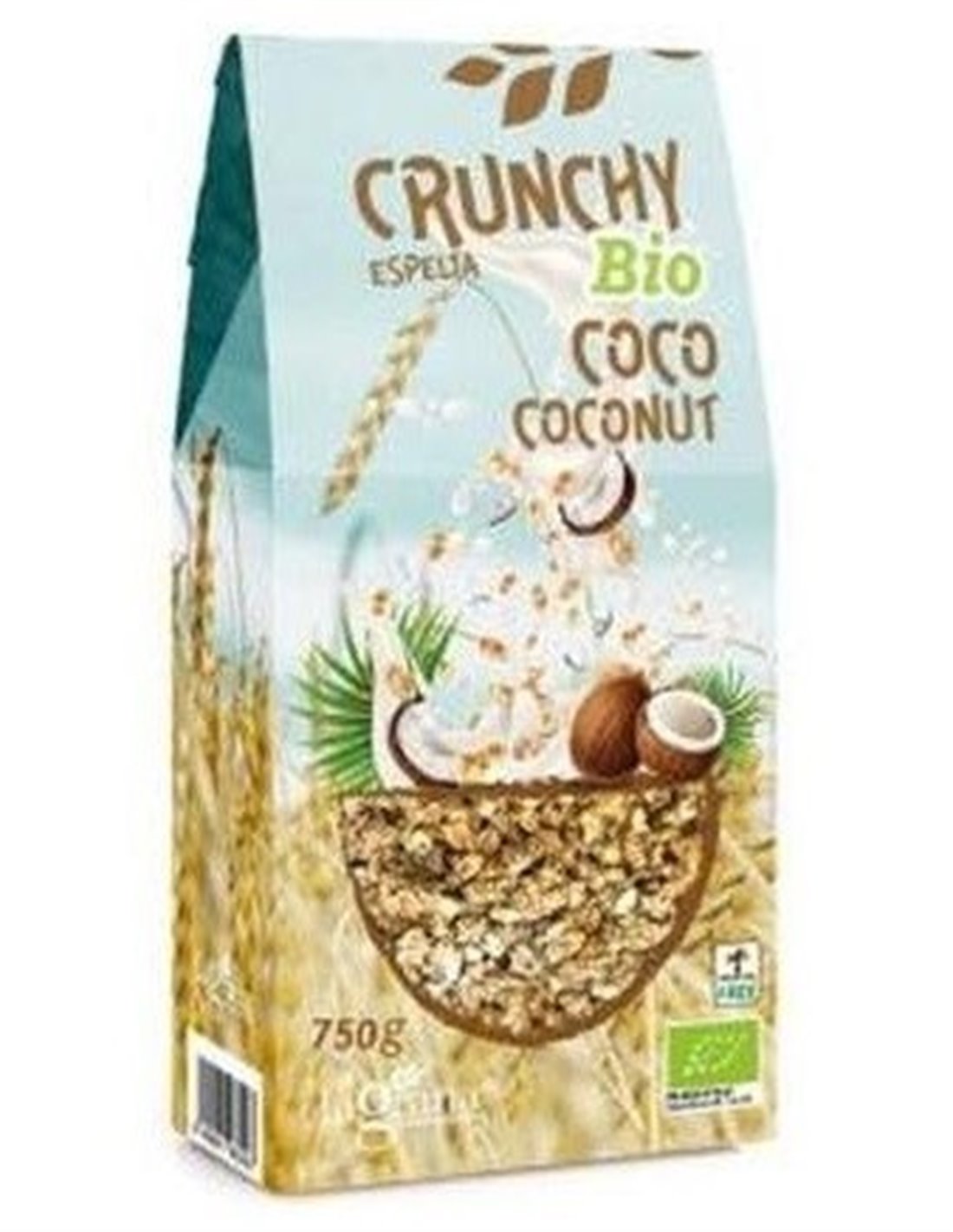 Copos de espelta integrales finos* (60,1%) \ Azúcar de remolacha* \ Aceite de girasol*\ Jarabe de arroz* \ Coco rallado* (8,4%)\ Arroz hinchado* (harina de arroz*, jarabe de arroz*, sal)\ Sal*\ \ *Ingredientes procedentes de la agricultura ecológica.\ + Contiene gluten. Puede contener trazas de leche, huevo, soja, cacahuete, frutos secos y sésamo.