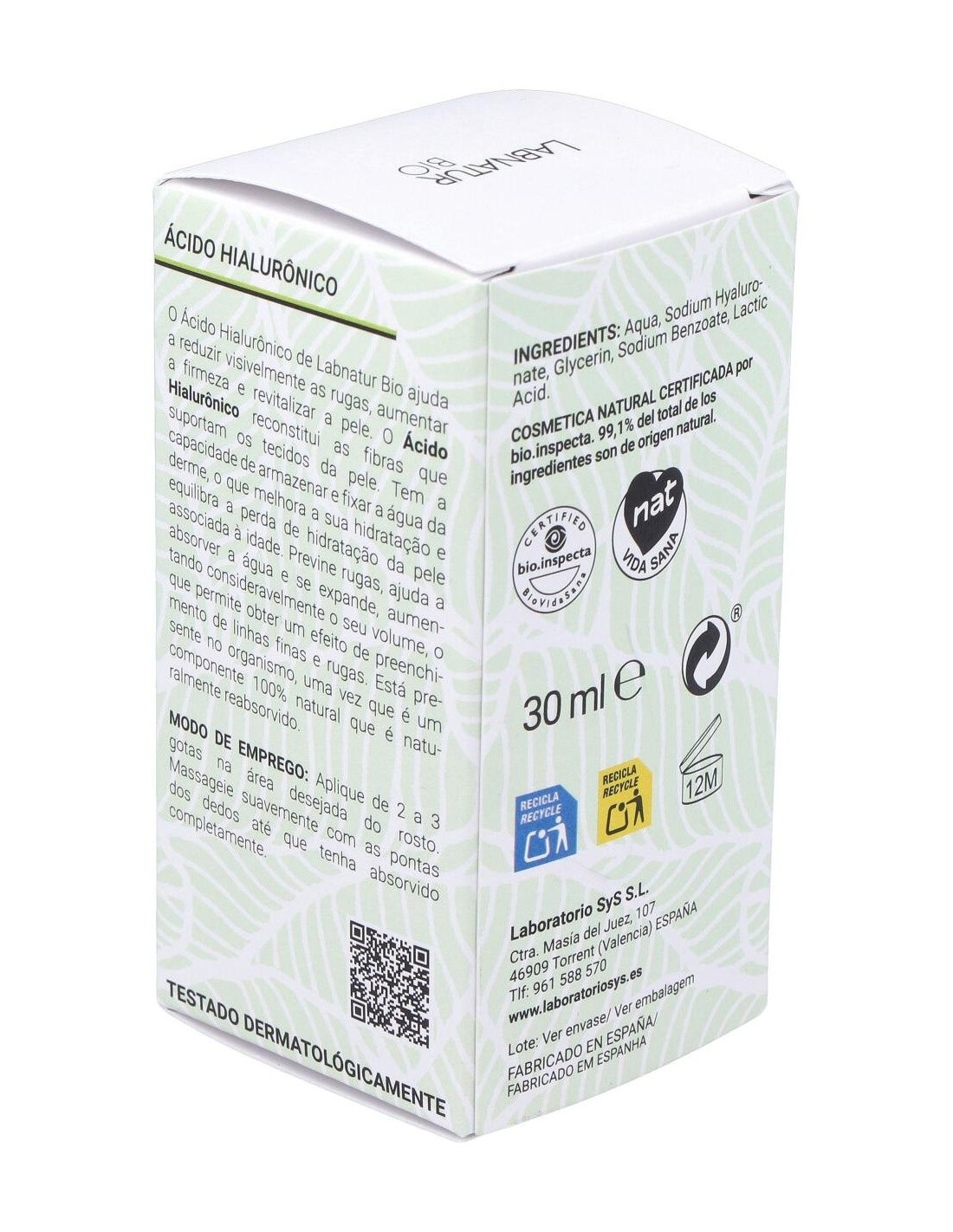 Ayuda a reducir visiblemente las arrugas, aumenta la firmeza y revitaliza la piel. El Ácido Hialurónico reconstituye las fibras que sostienen los tejidos de la piel. Posee la capacidad de almacenar y fijar el agua de la dermis, lo que mejora su hidratación y equilibra la pérdida de humedad de la piel asociada a la edad. Previene arrugas, ayuda a absorber el agua y se expande, incrementando su volumen considerablemente, lo que permite conseguir un efecto rellenador de las líneas de expresión y las arrugas. Está presente en el organismo, ya que es un componente 100% natural que se reabsorbe de forma natural. Cosmética Natural Certificada por bio.inspecta con ingredientes de procedencia ecológica, ingredientes de origen natural y fragancia natural.