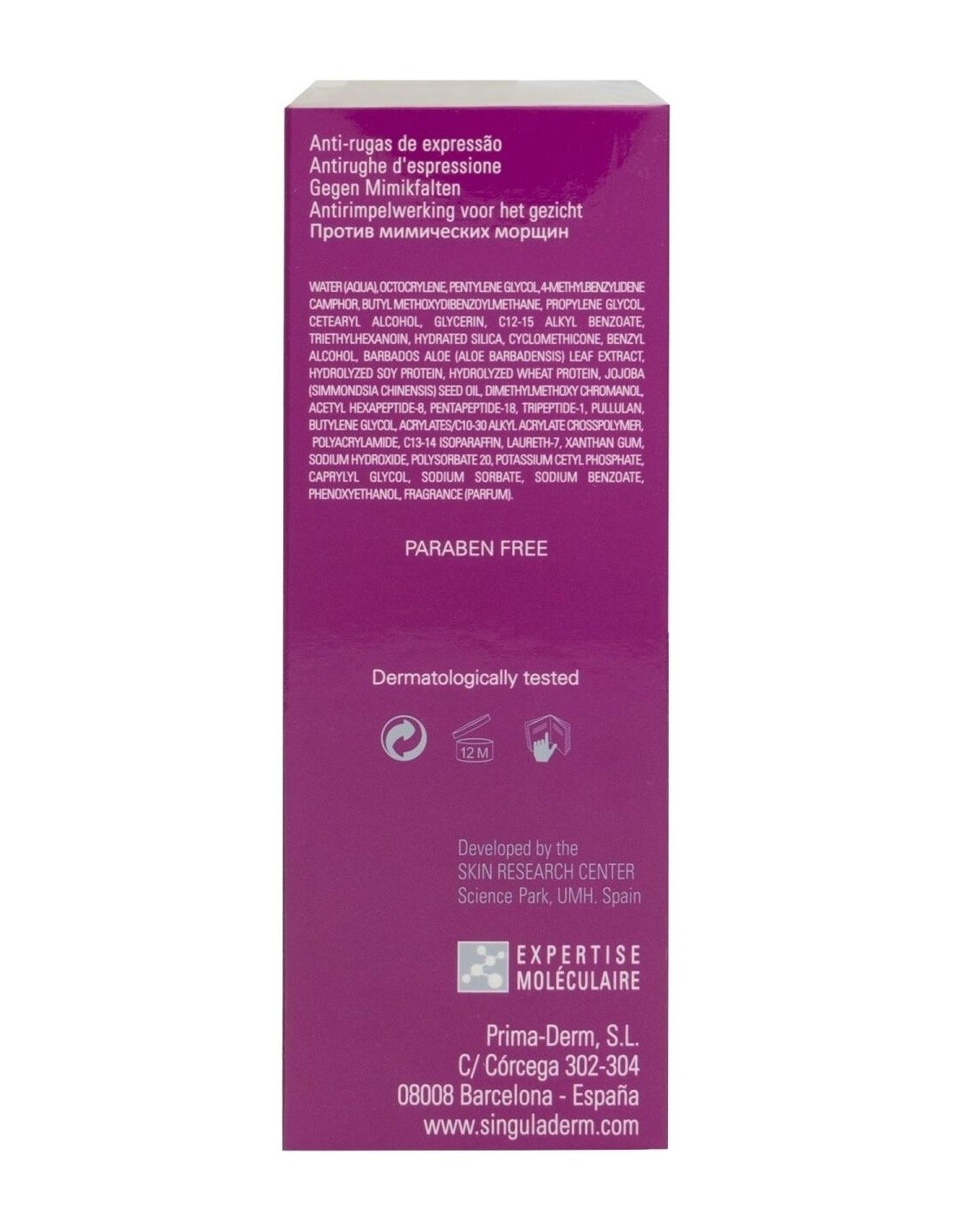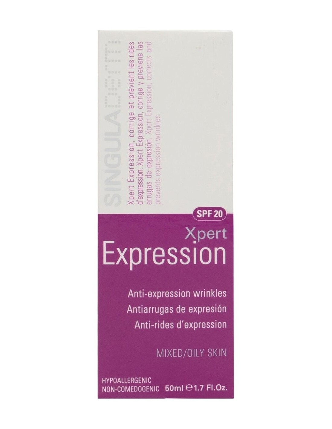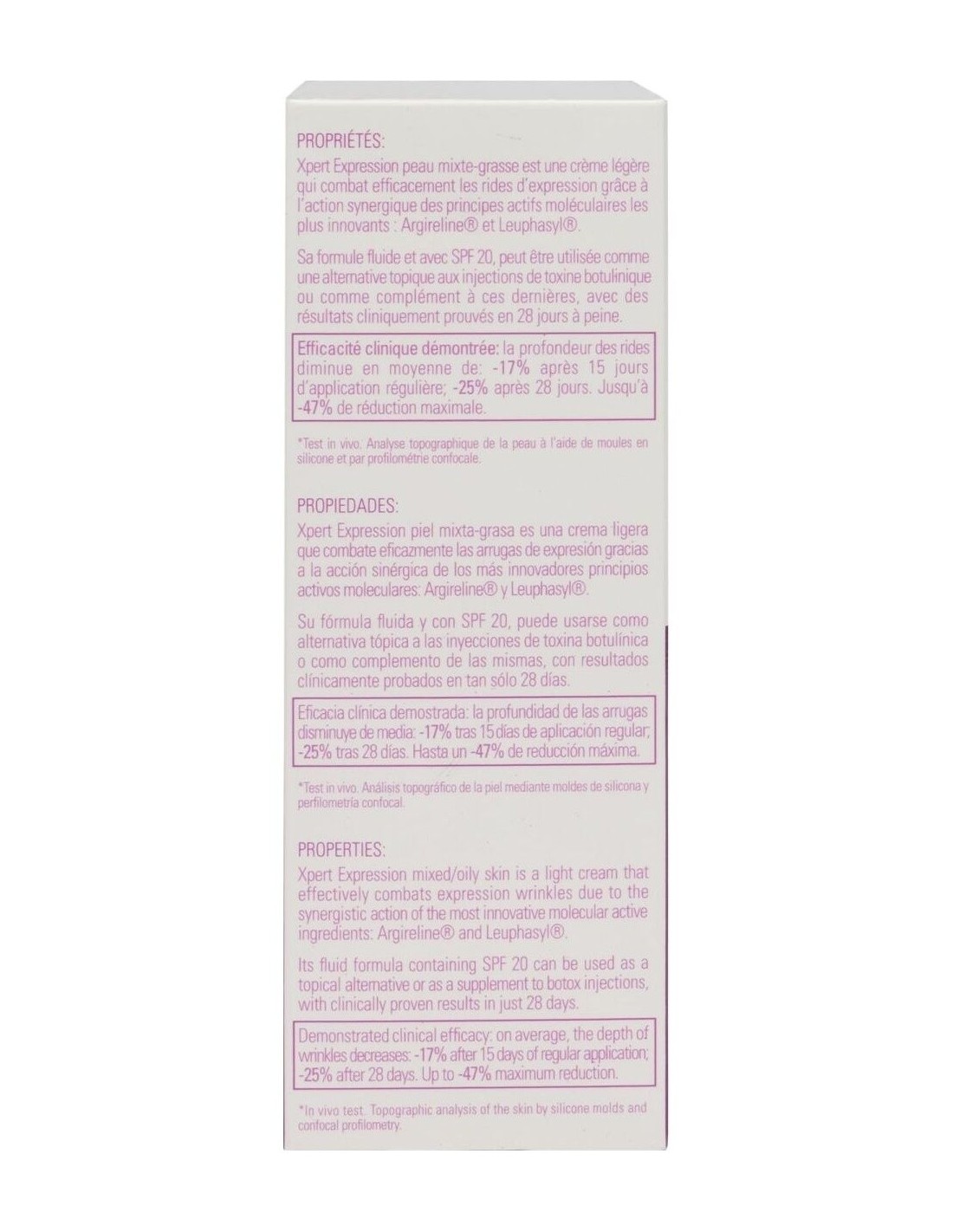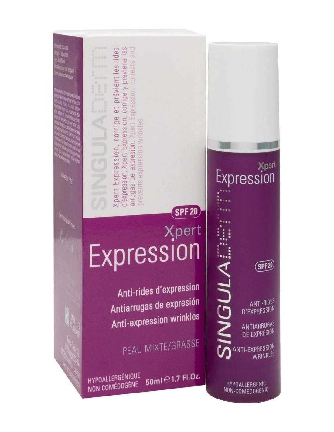Crema hidratante antiedad especialmente diseñada para corregir y prevenir las arrugas de expresión. Actúa doblemente sobre las arrugas de expresión además de prevenir las arrugas metabólicas y fotoinducidas. El efecto antiradicales libres de su exclusiva fórmula con péptidos biomiméticos protege la piel de los factores intrínsecos y extrínsecos que causan el envejecimiento, manteniéndola joven más tiempo. Puede usarse como alternativa tópica a las inyecciones de toxina botulínica o como complemento a las mismas, con resultados clínicamente probados. Potencia los resultados antiarrugas de expresión con nuestro sérum XPERT Sublime. Piel mixta/grasa. Hipoalergénico. Testado dermatológicamente.