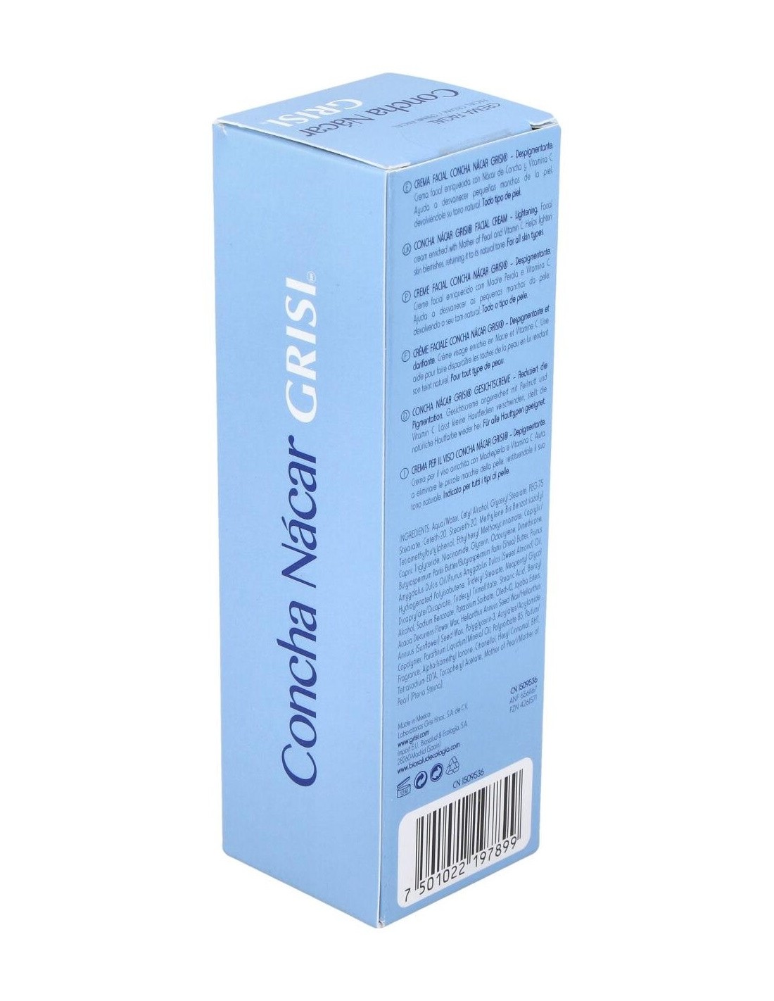 Grisi crema facial concha nacar regenerante es una crema facial despigmentante y regeneradora de la piel. Enriquecida a base de nácar de concha y vitamina c elimina manchas, pequeñas cicatrices y líneas de la piel.