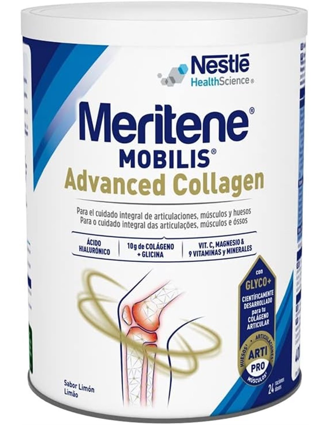 MERITENEMeritene® MOBILIS® Advanced Collagen es la nueva generación de complementos de colágeno, científicamente desarrollada para contribuir en apoyar la movilidad y flexibilidad, limitada con el paso de la edad o en situaciones de molestias articulares. La novedosa combinación GLYCO+ contiene Péptidos de Colágeno y Glicina, más vitamina C para contribuir a la formación normal de colágeno. Además, contiene otras vitaminas y minerales que ayudan al mantenimiento normal de las articulaciones, músculos y huesos, como calcio, zinc y vitaminas D y K. Sabor a limón.