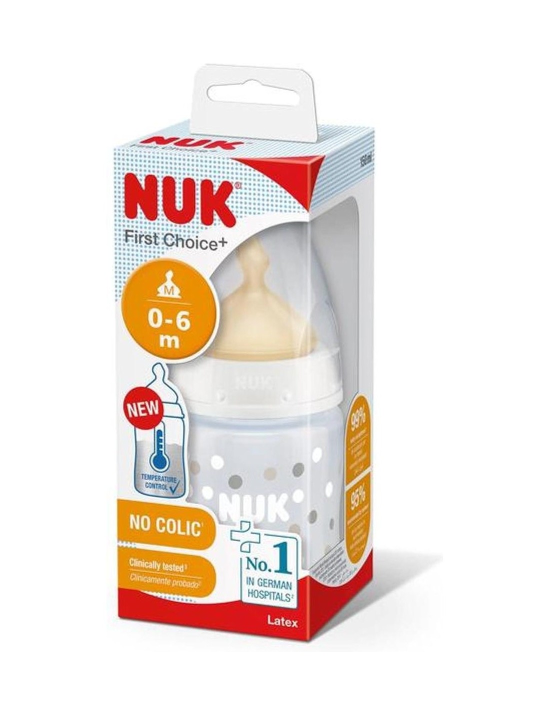 Con indicador de Control de Temperatura. El color cambia con la temperatura del contenido del biberón. Si el alimento está demasiado caliente, el indicador pasa de azul a blanco.\ No contiene sustancias nocivas; sin olor y sin BPA.\ Cuello ancho para facilitar el llenado y la limpieza.\ Tetina de silicona con forma anatómica que se adapta perfectamente al paladar del bebé.\ Tallas y medidas: 0-6m (M) \ Con sistema de ventilación NUK ANTI-COLIC AIR SYSTEM mejorado que ayuda a prevenir los cólicos.\ Incluye anillo de rosca, disco de cierre y tapa protectora.\ Disponible en látex\ Capacidad 150 ml.\ \ *El color y diseño de la imagen, pueden cambiar.