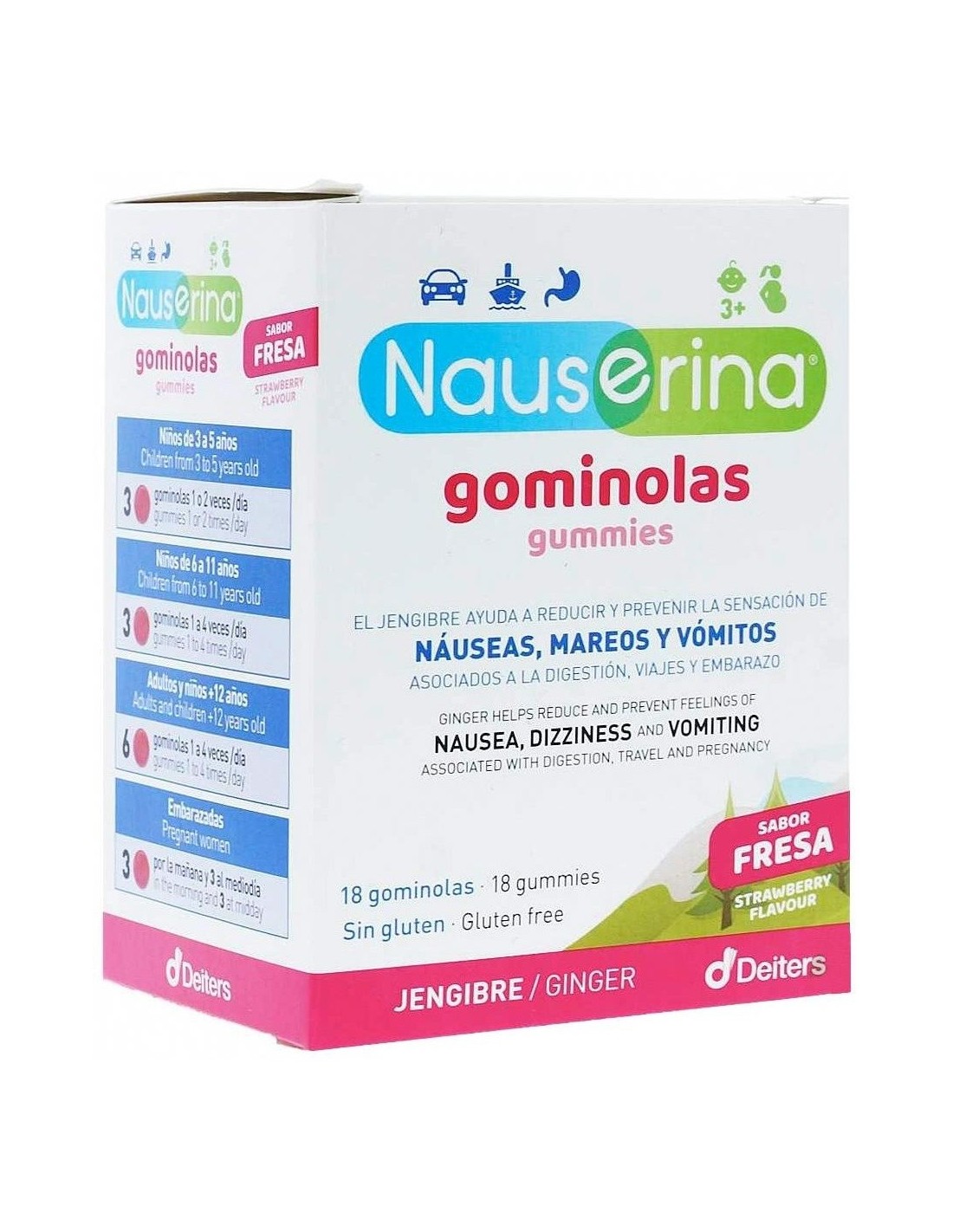 Nauserina 18 gominolas es un complemento alimenticio a base de extracto de jengibre. Ideal para reducir y prevenir la sensación de náuseas, mareos y vómitos asociados a viajes, digestión y embarazo.