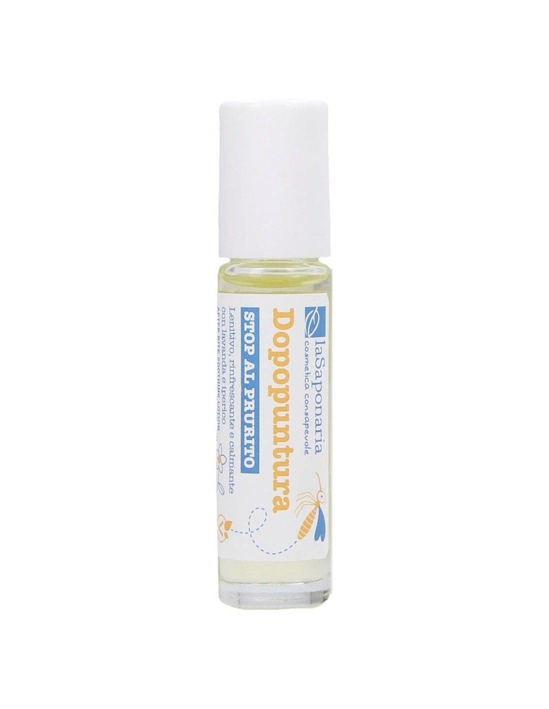 LA SAPONARIARoll-on a base de aceites esenciales de lavanda, geranio y hipérico para calmar el picor. Gracias al alto porcentaje de principios activos naturales, tiene una fuerte acción calmante, emoliente y refrescante. De forma totalmente natural, ofrece un alivio de la sensación de picor y aporta un bienestar inmediato a la piel, aliviando el escozor y escozor de las picaduras de insectos. Muy fácil de usar gracias al práctico roll-on, permite una aplicación precisa y eficaz en la misma mordida, sin derrochar producto.