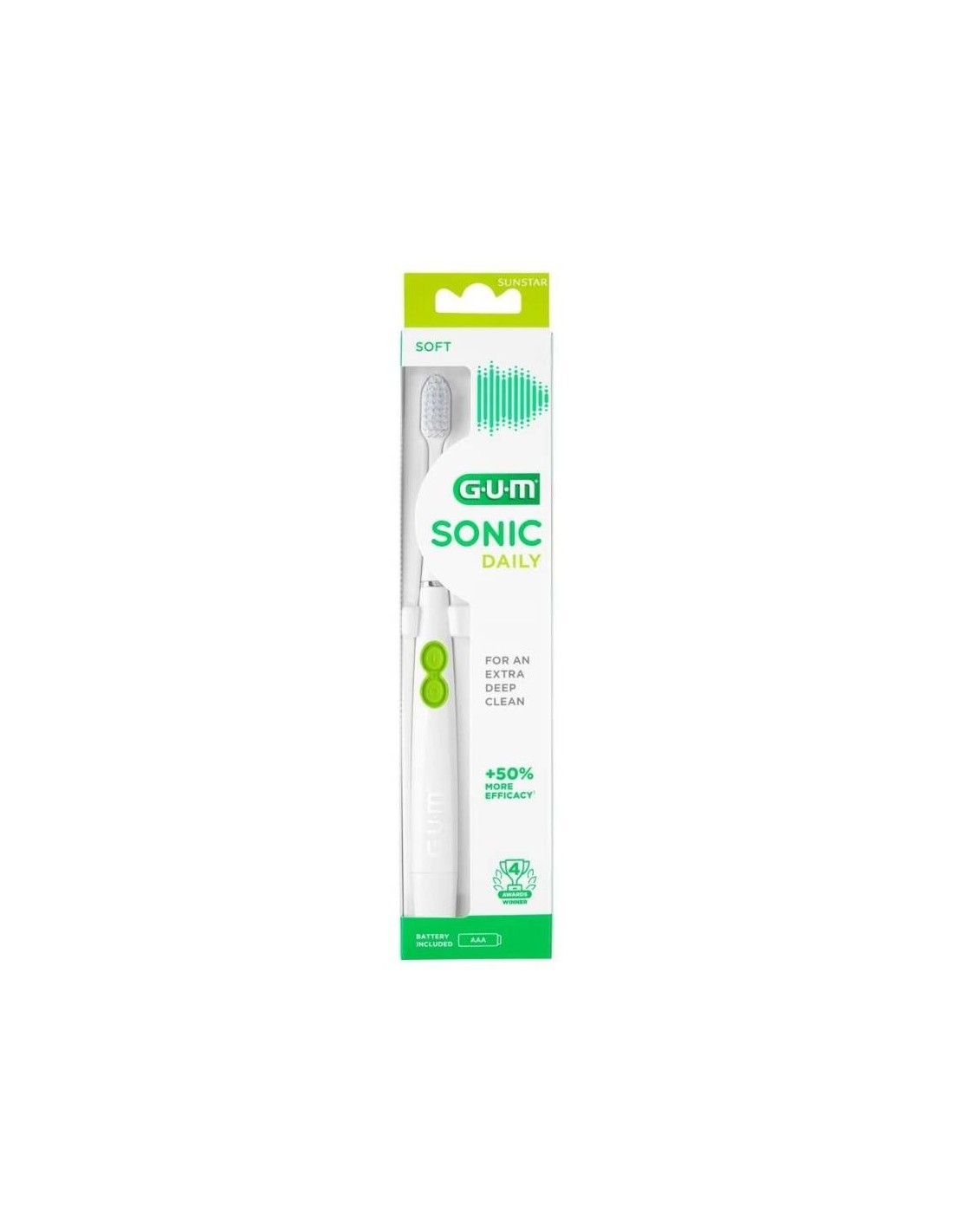 Proporciona una limpieza profunda y suave para el cuidado diario de dientes y encías. Sus filamentos suaves, dispuestos a doble nivel y cónicos eliminan un 50% más la placa interdental y penetran 47 veces más por debajo de la línea de la encía. Galardonado con 4 premios otorgados por consumidores de Francia, Italia, Polonia y España. Diseño elegante, compacto y sin cables. Hasta 3 meses de uso con la pila AAA incluida. Incluye capuchón protector y 3 anillos de color para personalizar el cepillo. Cabezal reemplazable para reducir el desperdicio de plástico. Compatible con los cabezales de recambio GUM SONIC DAILY, GUM ActiVital® SONIC y GUM SONIC SENSITIVE.
