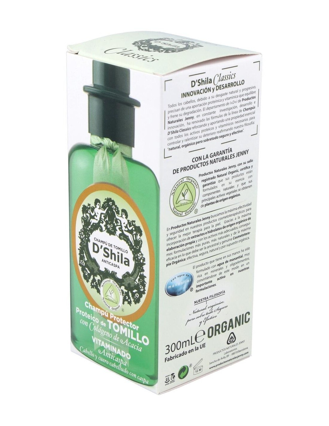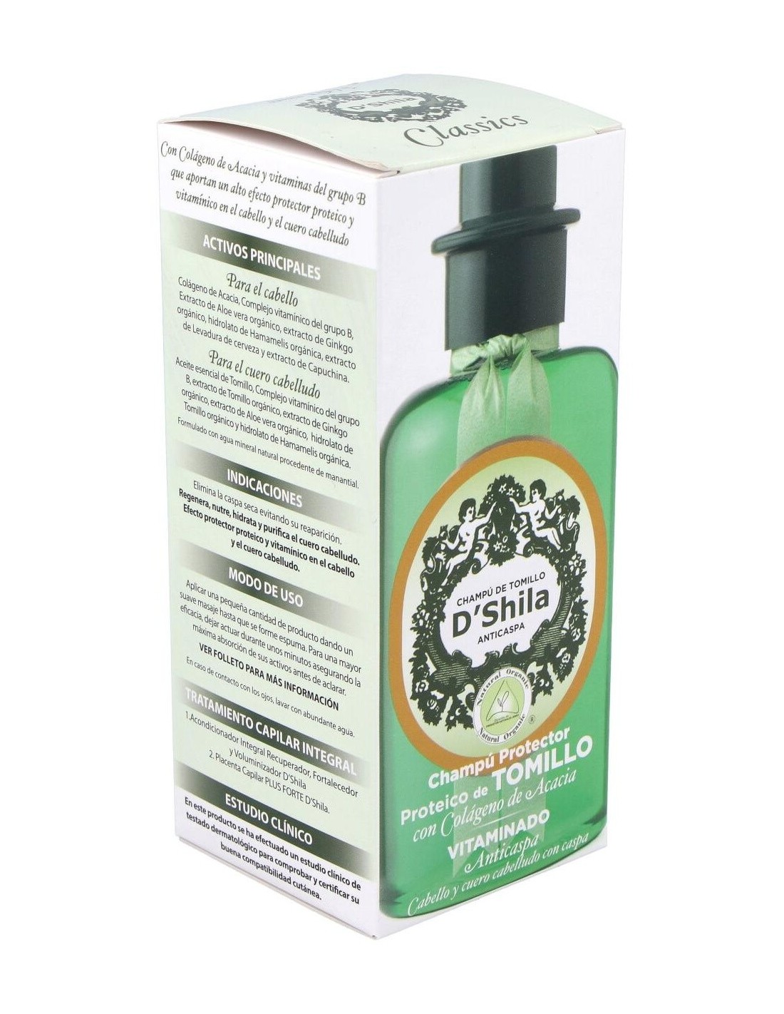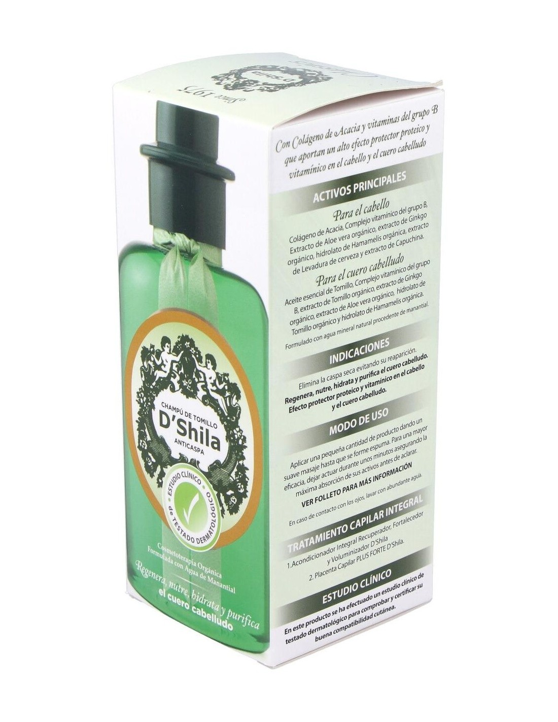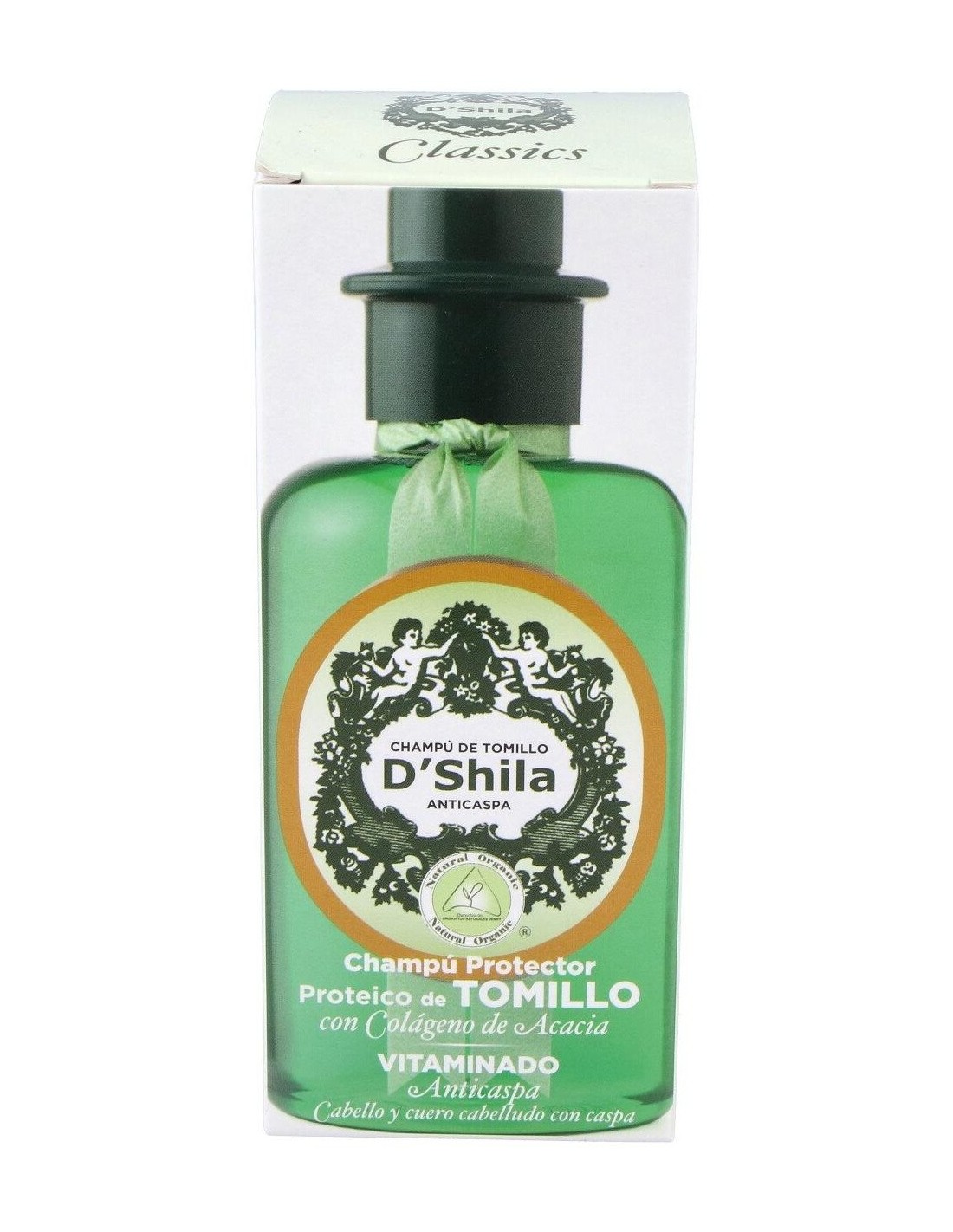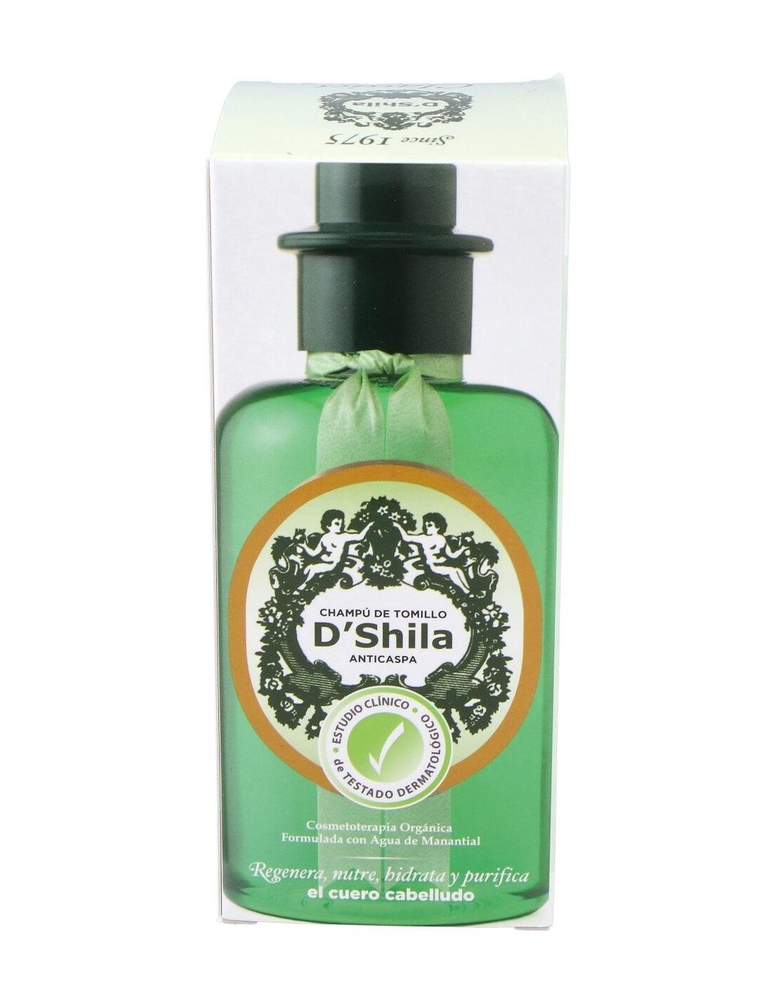 D'shila champú de tomillo anticaspa es un delicado champú perfecto para sanear el cuero cabelludo afectado por la caspa. Proporciona una intensa limpieza, dejando un brillo natural sobre el cabello, para dejar el pelo más suave y flexible..
